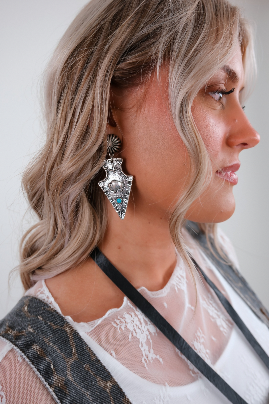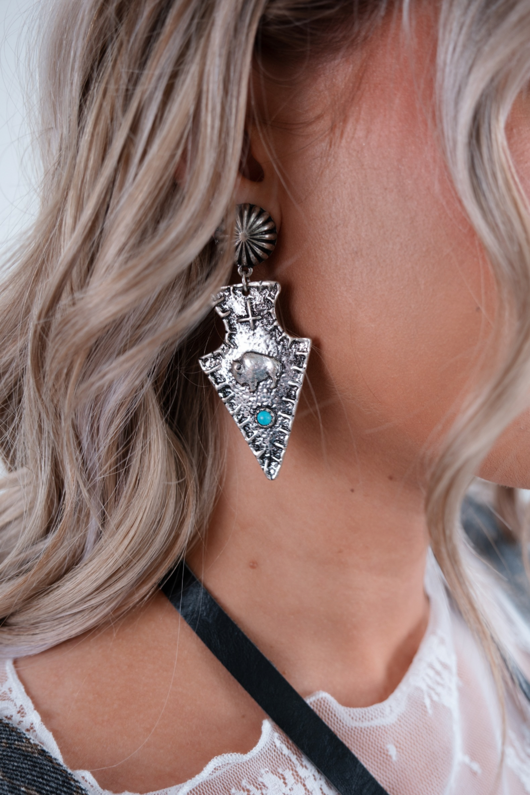 These striking Western-inspired earrings feature a silver stud with a hanging charm in the shape of an arrowhead. The charm is adorned with a detailed buffalo design and accented with a vibrant turquoise stone, adding a pop of color and a rugged Southwestern vibe.