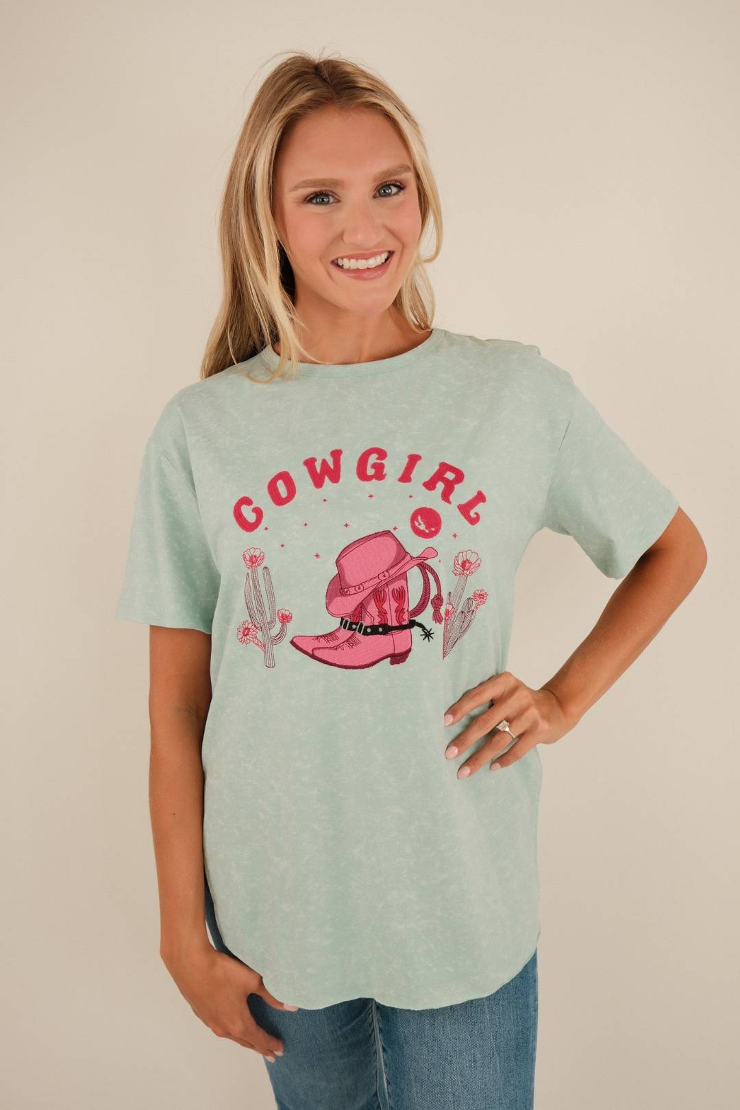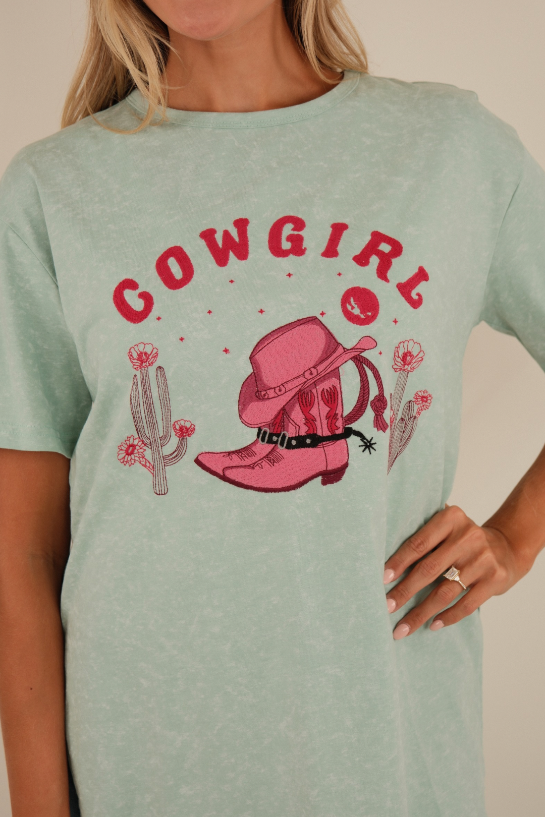 Show off your cowgirl spirit in this bold and beautiful turquoise acid-washed tee! Designed for comfort and western charm, this standout piece features a flattering scoop hemline with side slits for an effortless fit. The hot pink embroidered accents across the chest showcase cowgirl boots, a lasso, and cacti, adding the perfect pop of personality to this rugged yet feminine tee.