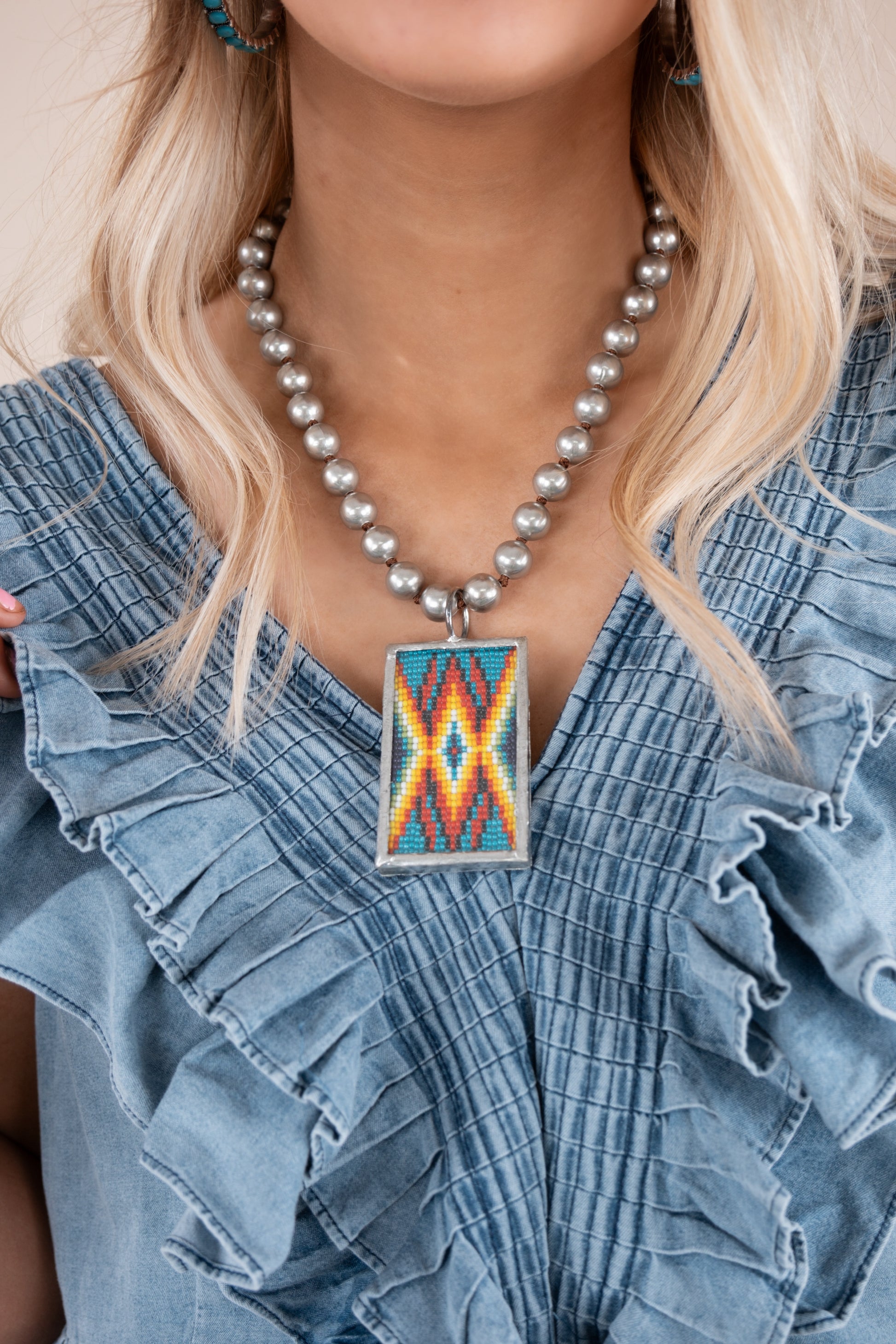 Make a bold statement with this stunning Aztec-inspired necklace, designed to elevate any Western outfit. Featuring large silver beads and a large rectangular charm with intricate Aztec beaded designs, this necklace is a perfect fusion of vibrant colors and rustic charm. The vivid hues of red, yellow, orange, white, turquoise, green, and black add energy and flair, making this piece the perfect accessory to stand out and make a statement.