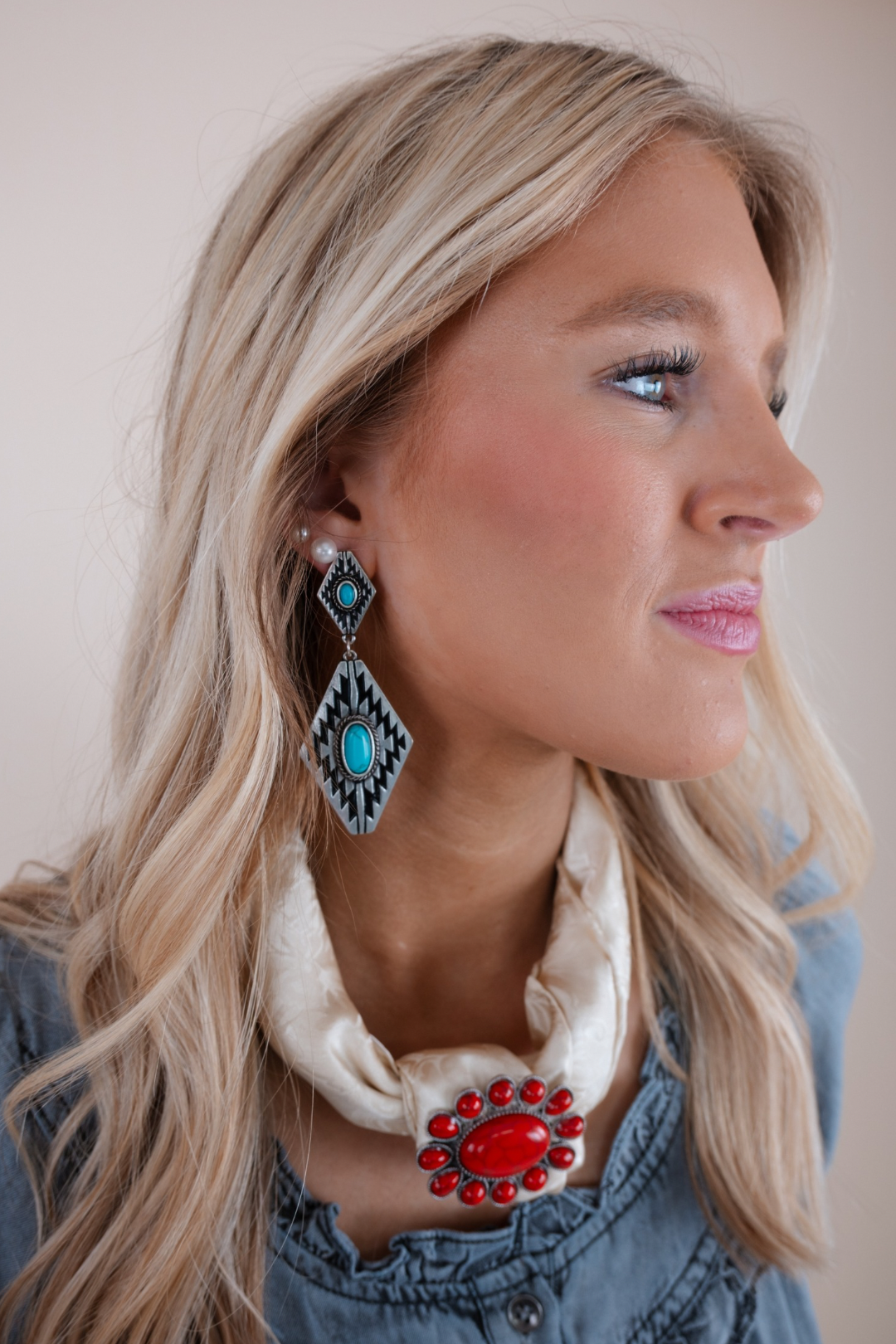 Make a bold statement with these stunning Aztec-style Western earrings. Featuring intricate detailing and vibrant turquoise stones, these earrings capture the spirit of Southwestern style while adding a pop of color to your look. The lightweight design includes a soft back for comfort, making them perfect for all-day wear.