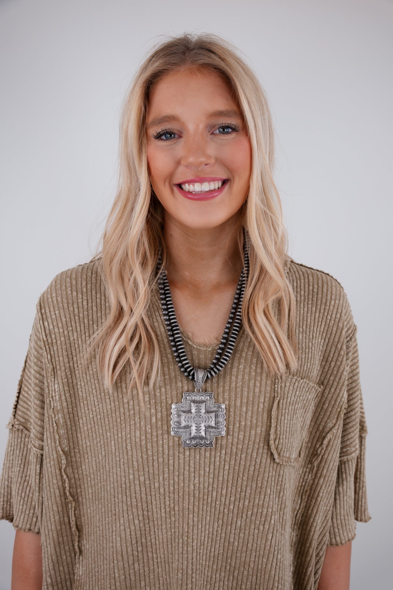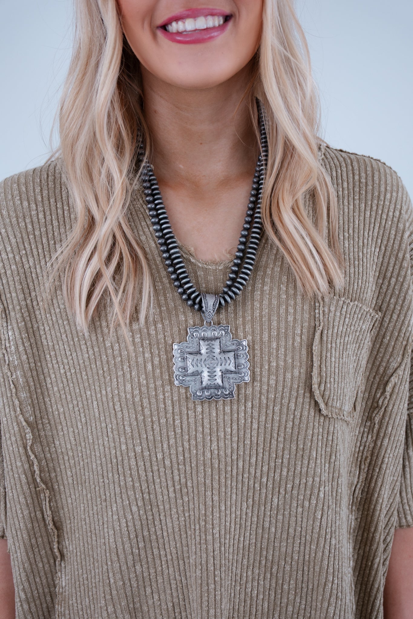 Channel ancient power and modern style with the Aztec Majesty Necklace. Crafted in a brushed silver hue, this stunning double-strand design features chunky, textured beads that give it a bold, confident look. The focal point is the striking Aztec-themed accent piece, rich in intricate patterns that make this necklace a true standout.