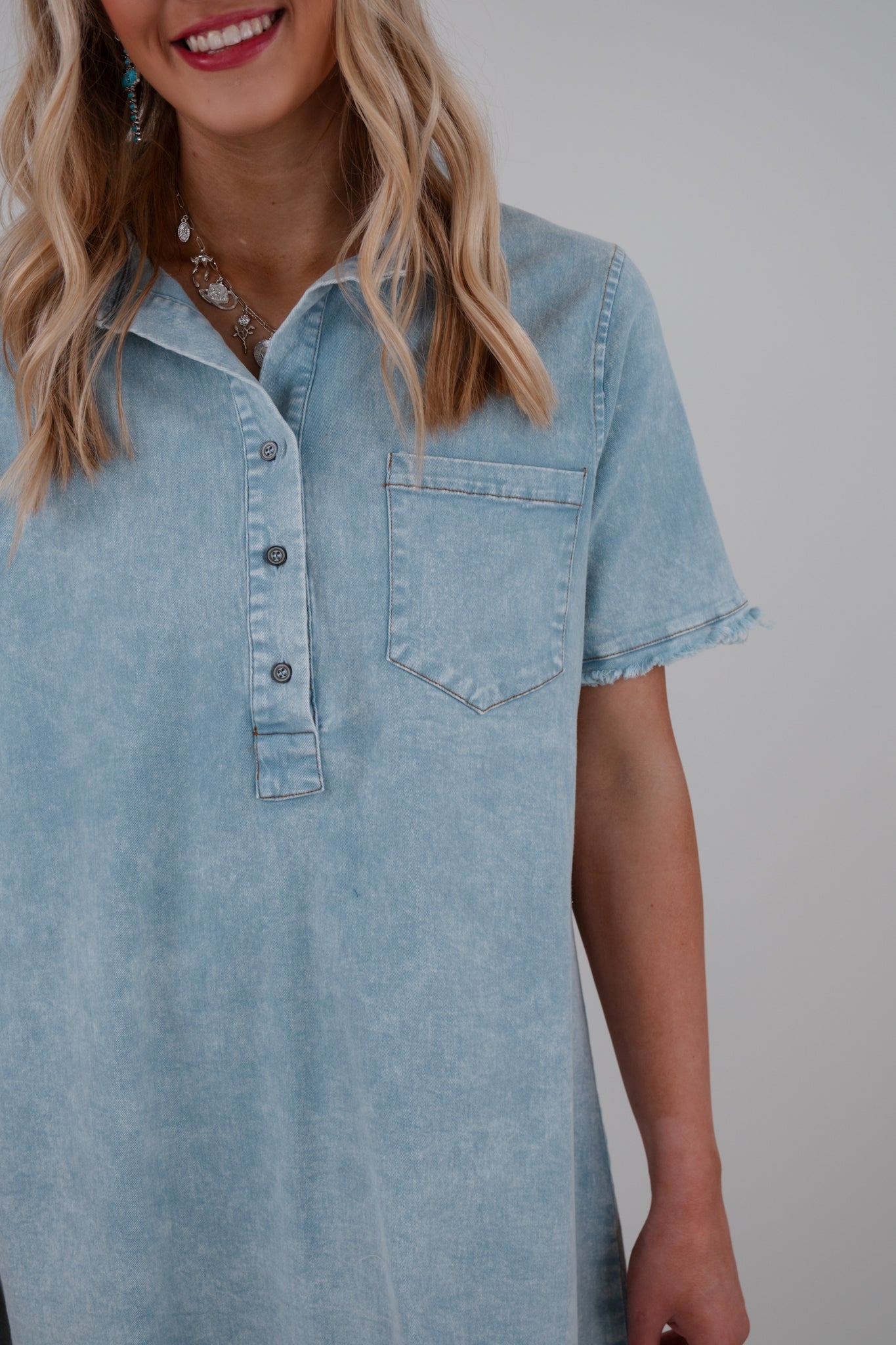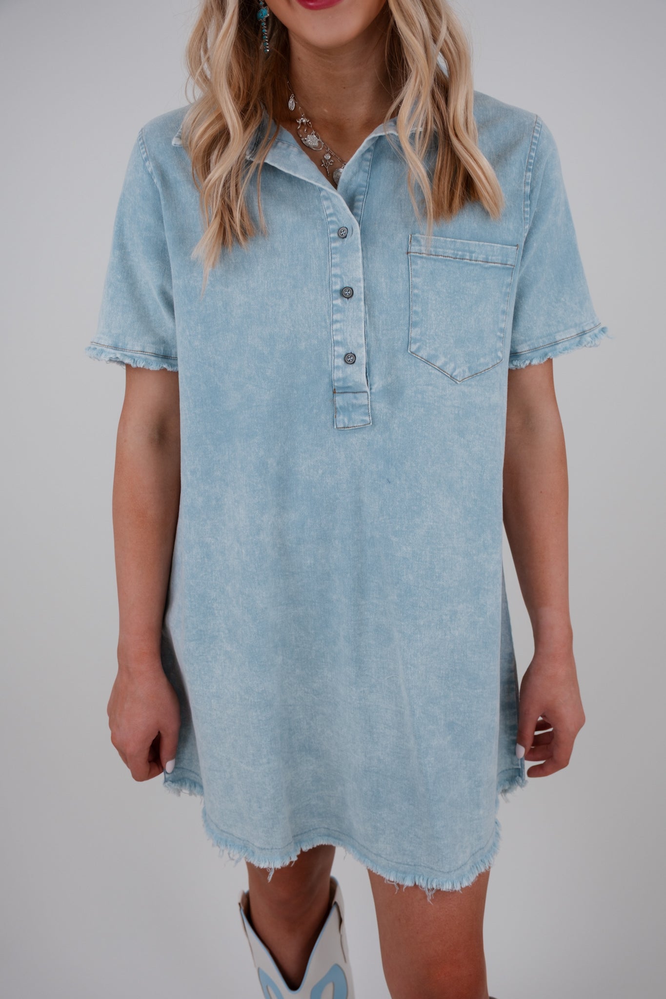 Simple, sweet, and effortlessly cool—the Bluebonnet Breeze Dress is your go-to for easy western charm. Crafted from lightweight denim, this A-line silhouette features a button-up neckline, front pocket, and frayed edge details along the sleeves and hemline for that lived-in, carefree look. Whether you're dressing it up with boots or keeping it casual with sneakers, this dress is made for sunny days and country ways.