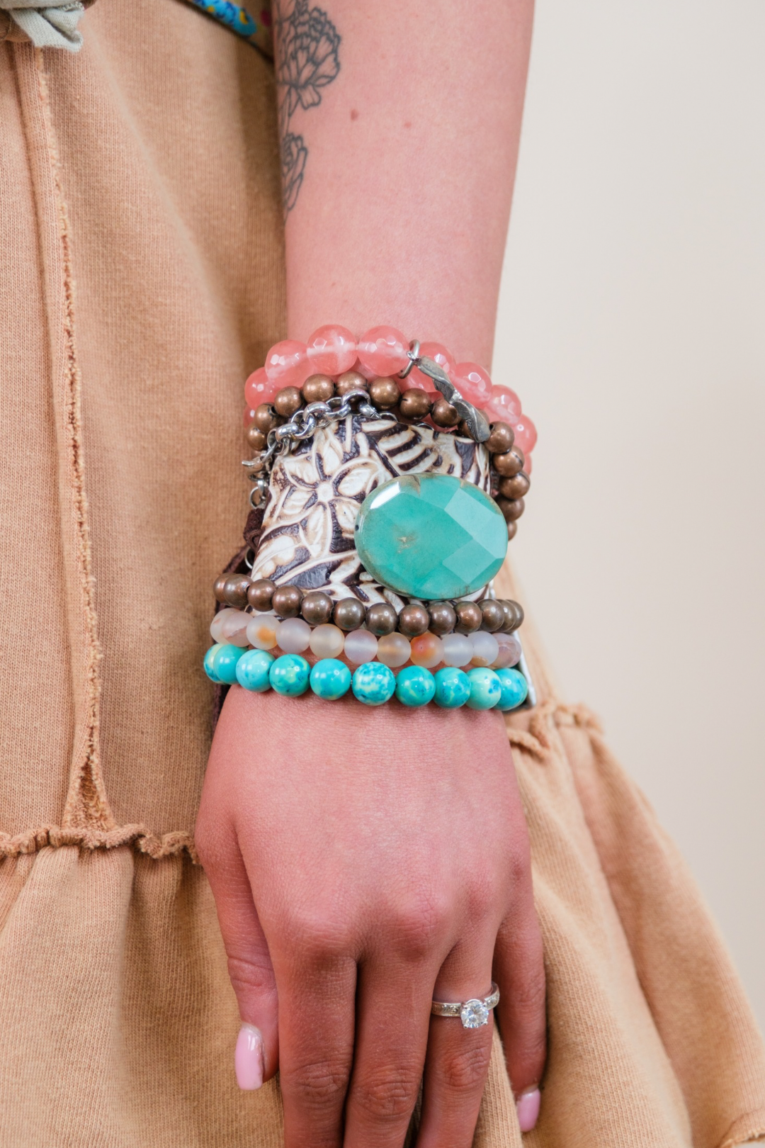 Add the perfect finishing touch to your Western attire with this stunning 7-layer statement bracelet. Featuring a blend of clear pink beads, Western-inspired charms, and rustic leather details, this bracelet is an eye-catching piece that speaks to both boho and Southwestern styles. The layers include a clear pink medium bead with a flower charm, a small silver chain with Western charms, a small brown bead, a leather wrap with tooling and a turquoise stone with a leather tassel, a clear bead with a silver round charm, and a small green bead with a clear moon charm.