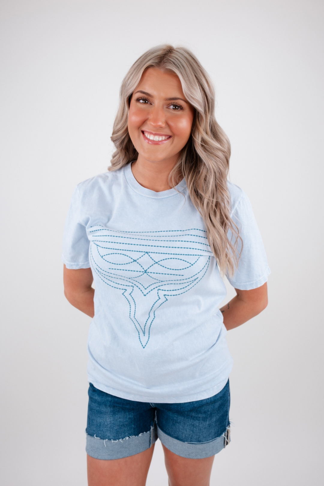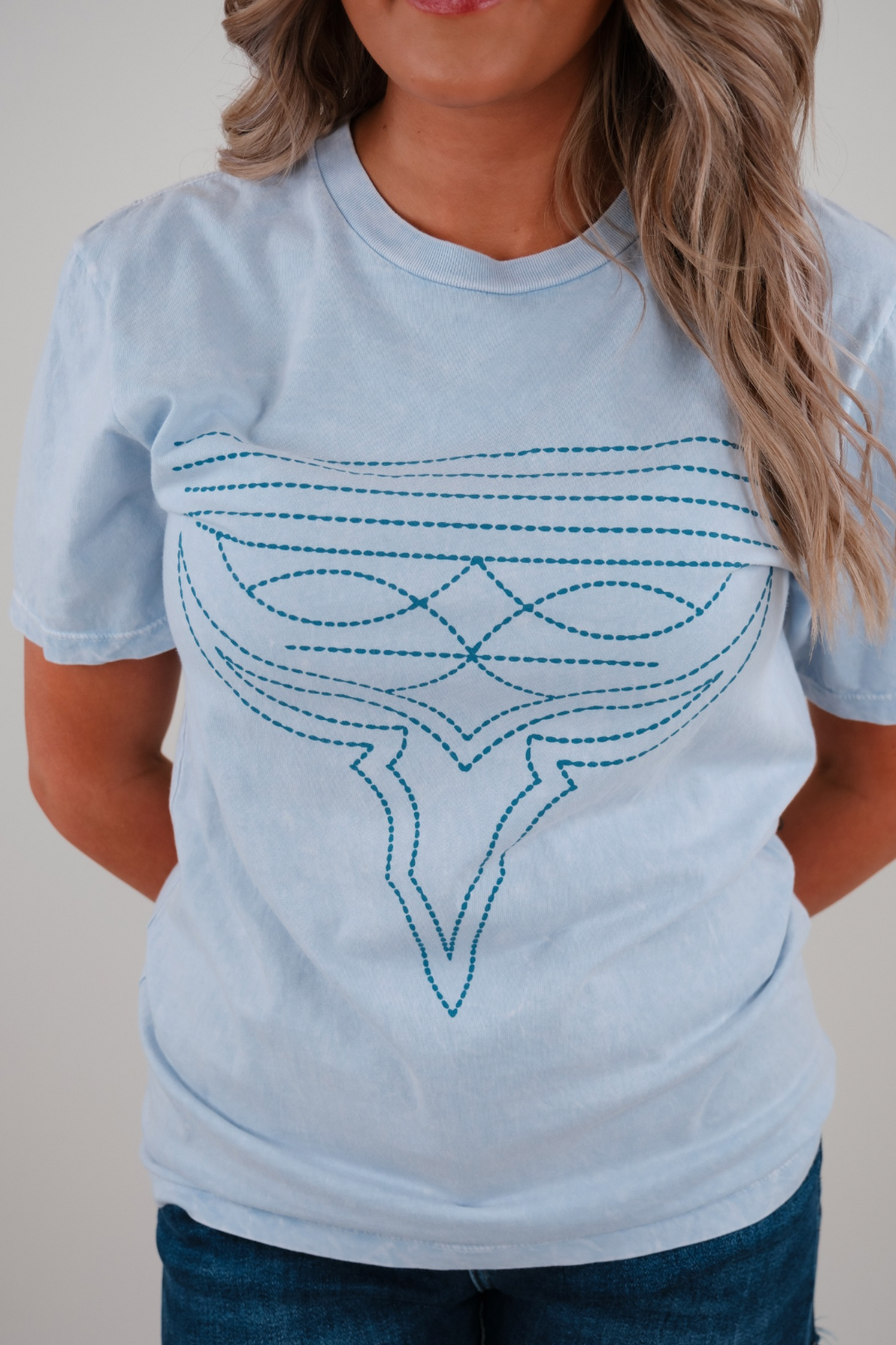 This boot stitch graphic tee combines vibrant light blue and classic western style, making it a perfect addition to any cowgirl's wardrobe.