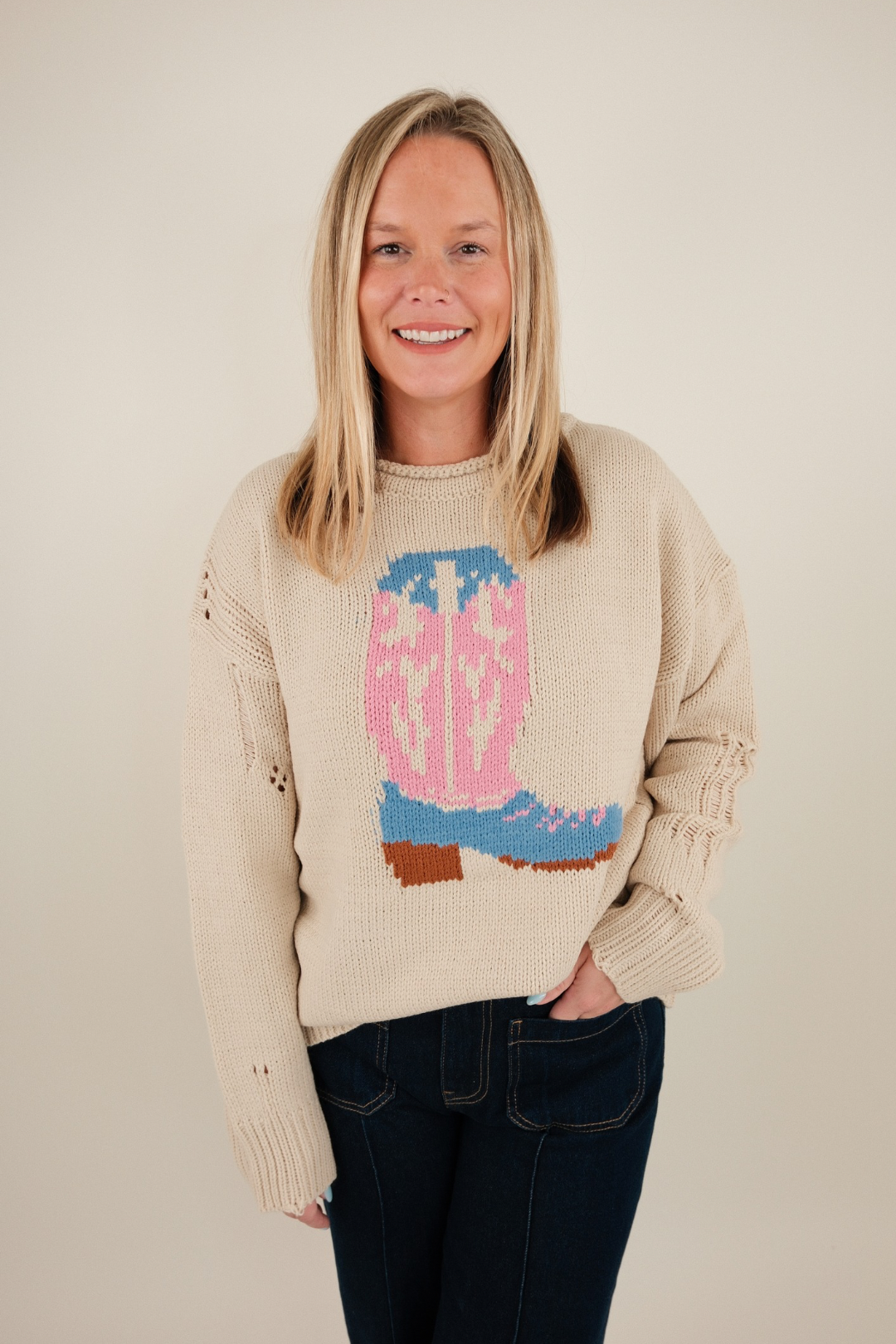 Add a little playful western charm to your cozy layers with the Boots & Dreams Knit Sweater. Made in a soft sand-colored knit with light distressing throughout for a vintage, lived-in feel, this sweater is finished with a bold pink-and-blue cowgirl boot graphic across the front. Its relaxed fit makes it easy to style with denim, skirts, or layered over dresses — perfect for rodeo nights, casual weekends, or everyday cowgirl style.