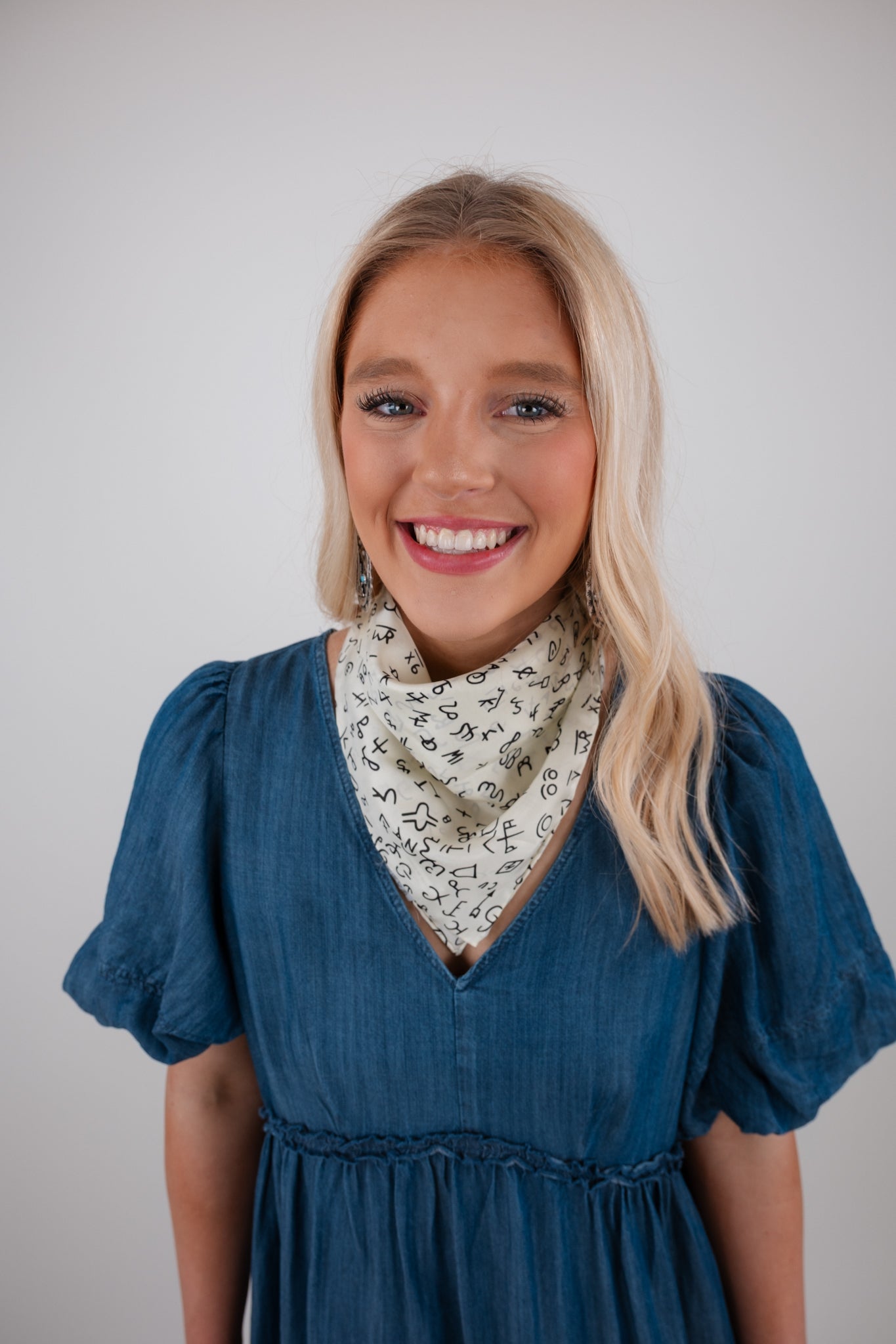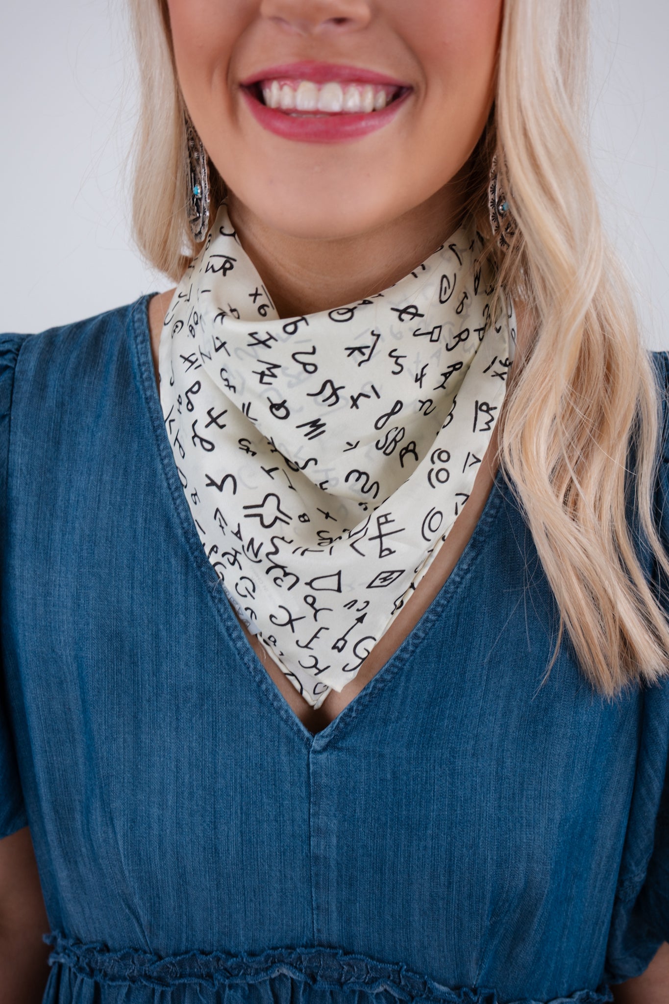 Small in size but big on western flair, the Brandin' Iron Silk Scarf is the perfect finishing touch to any cowgirl look. Measuring 20" x 20", this 100% silk scarf feels buttery soft against the skin and features a timeless cream backdrop adorned with classic black western brands. Whether you knot it at your neck, tie it around your wrist, or use it to dress up your hat or bag, this piece brings a polished yet rugged charm to your outfit.