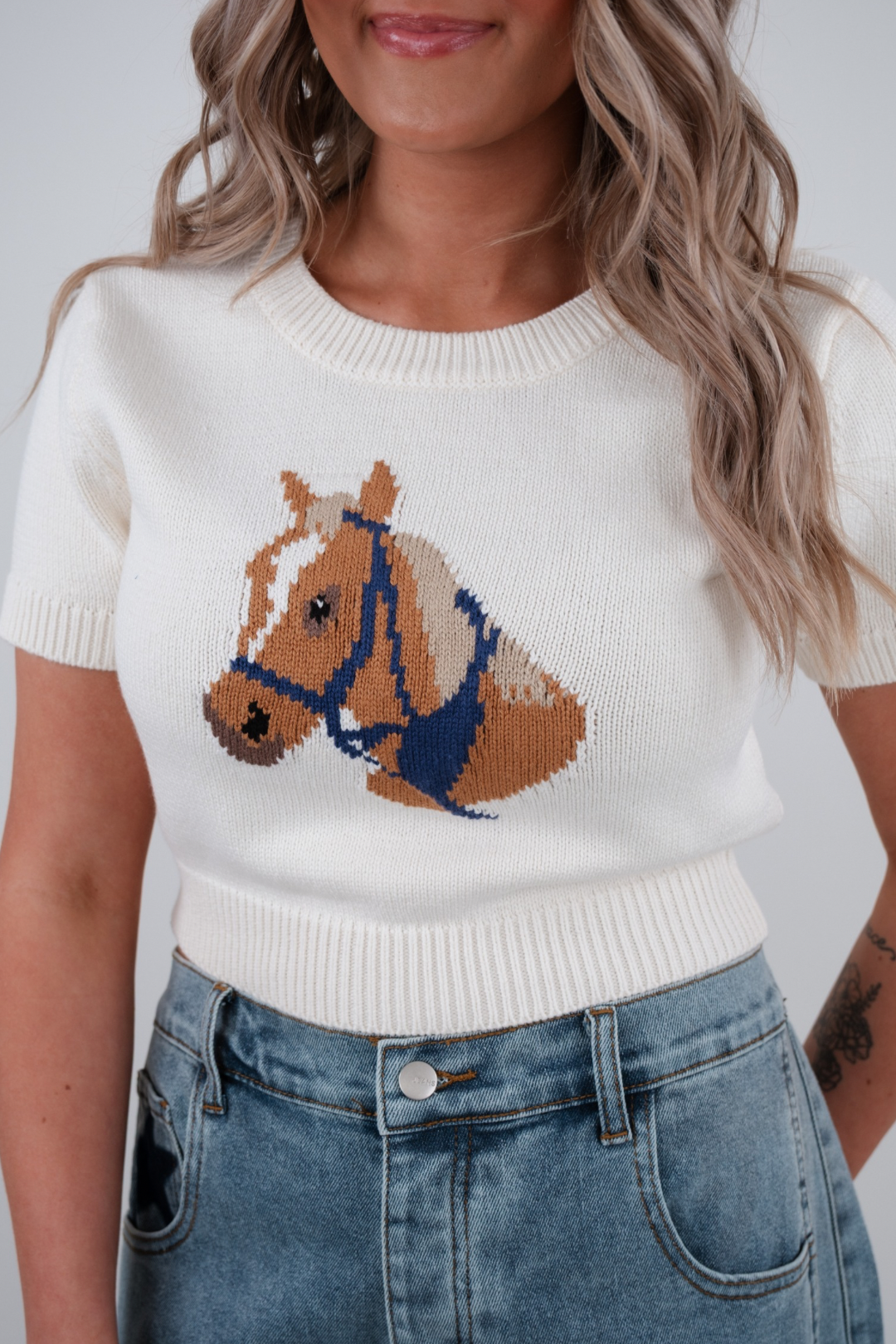 The Bridle & Breeze Knit Sweater is the perfect mix of playful and western-chic. This cropped knit sweater features a brown horse with a blue bridle stitched front and center—bringing just the right touch of rustic whimsy to a cozy, modern silhouette.