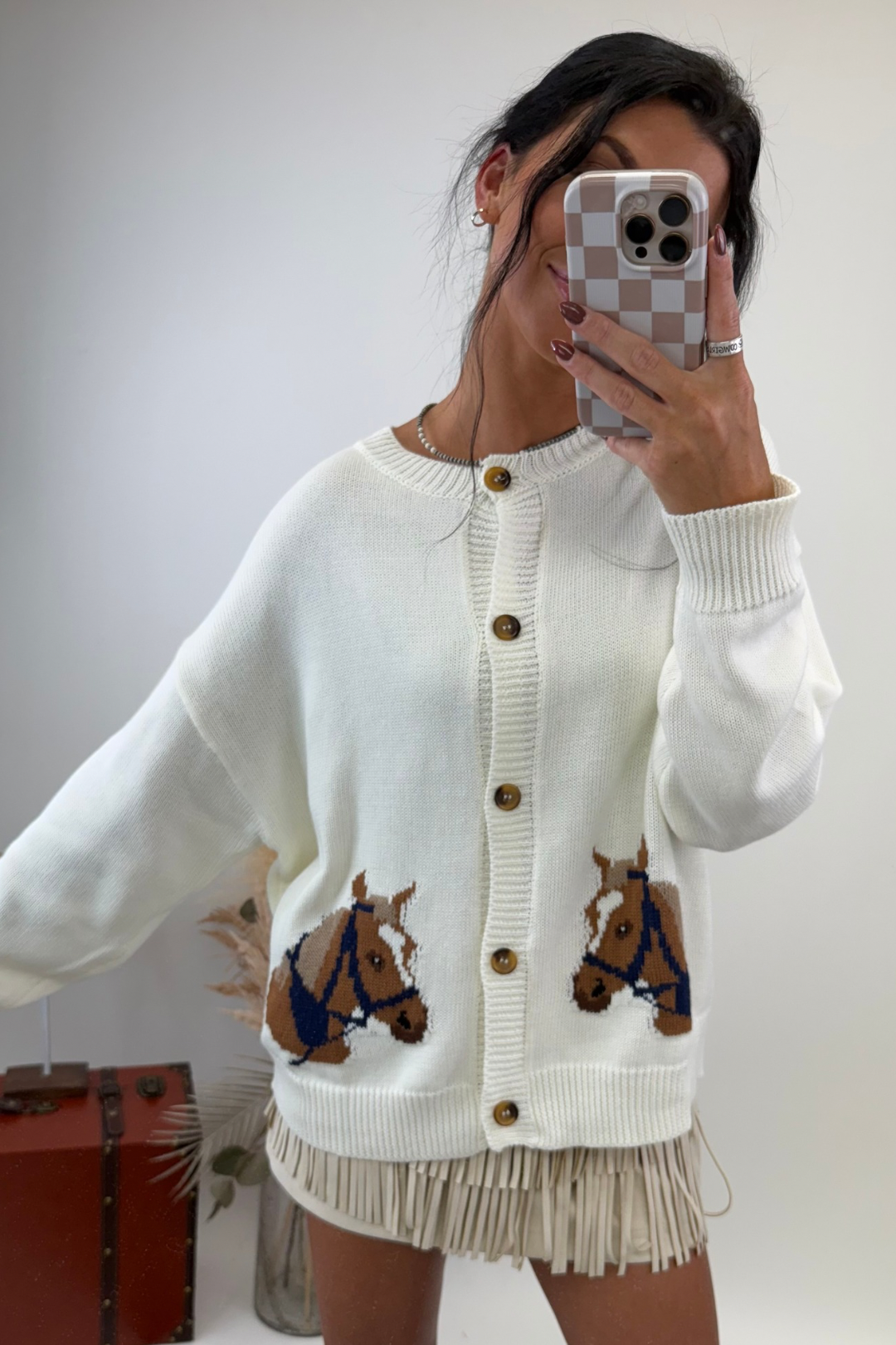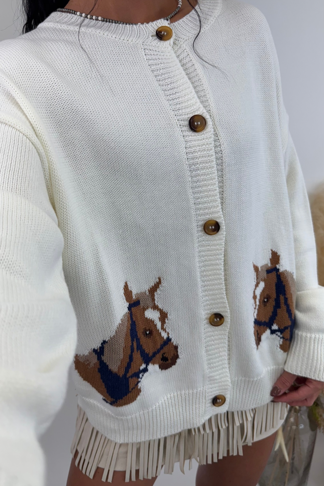 Wrap yourself in timeless equestrian style with the Bridle Crest Knit Cardigan. This cream, long-sleeve button-down sweater is crafted in a soft knit and finished with bridled horse head designs on each side, giving it a bold western touch. Perfect for layering over blouses, dresses, or denim, this cardigan blends cozy comfort with ranch-ready sophistication.