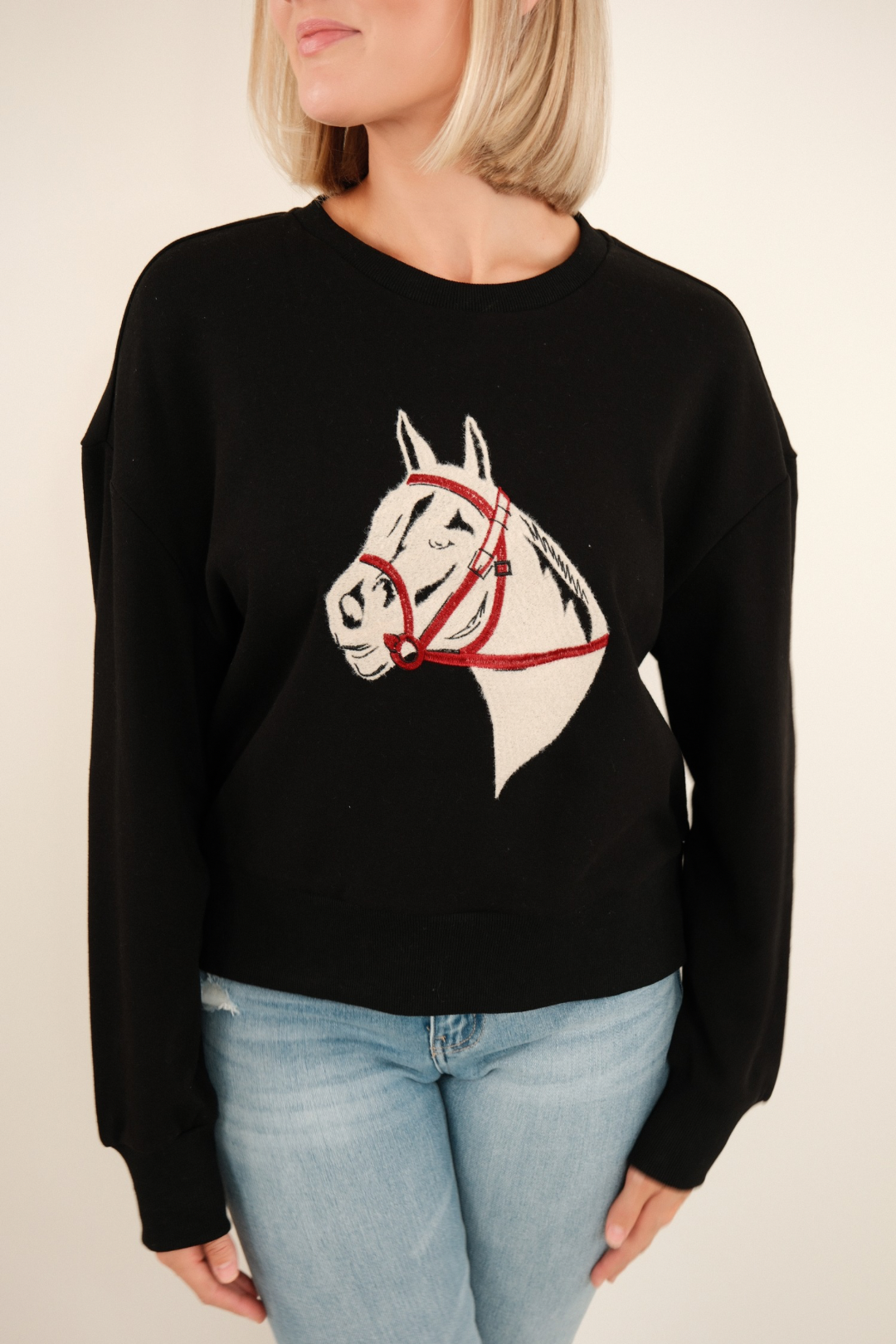 Classic comfort meets equestrian elegance in the Bridle & Grace Embroidered Pullover. Crafted in soft black fabric, this cozy sweatshirt is elevated with an intricate ivory horse head embroidered across the front. The striking red bridle adds a bold pop of color, making the design stand out with western sophistication.
