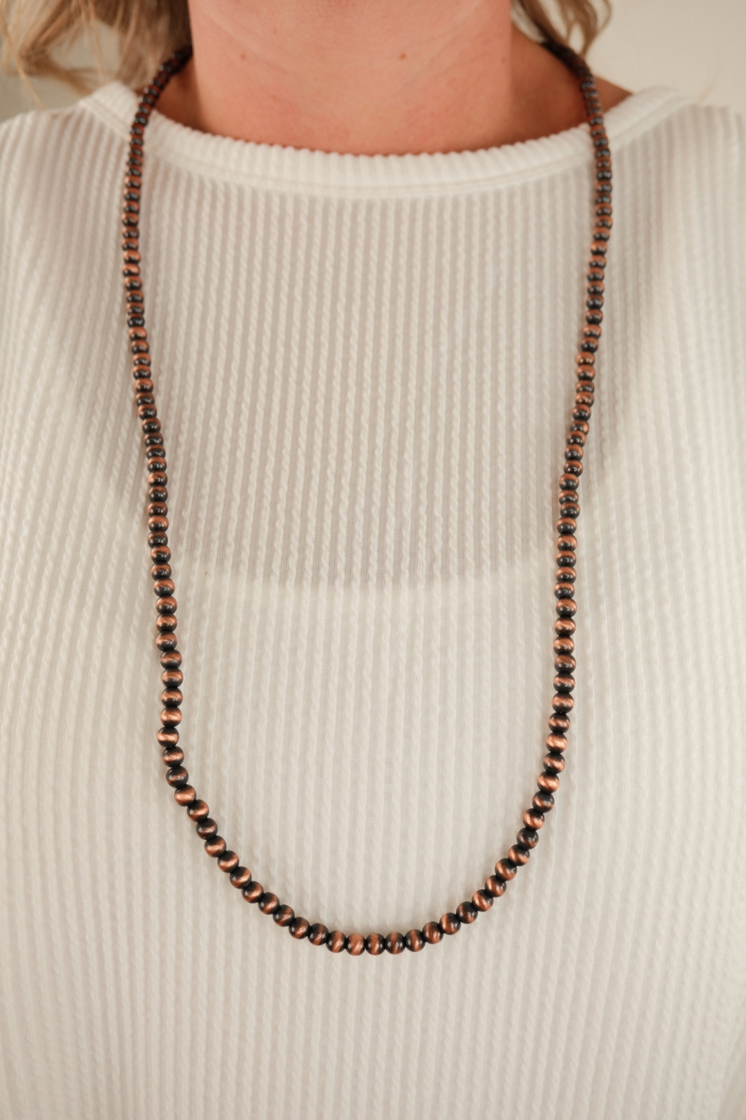 Simplicity meets style with the Bronze Ember Necklace. This long strand of chunky bronze beads offers the perfect touch of southwestern warmth, ideal for layering with other pieces or wearing solo for a minimalistic yet bold look. The rich, earthy tones of the beads make it a versatile piece that can complement any outfit, from casual to chic.