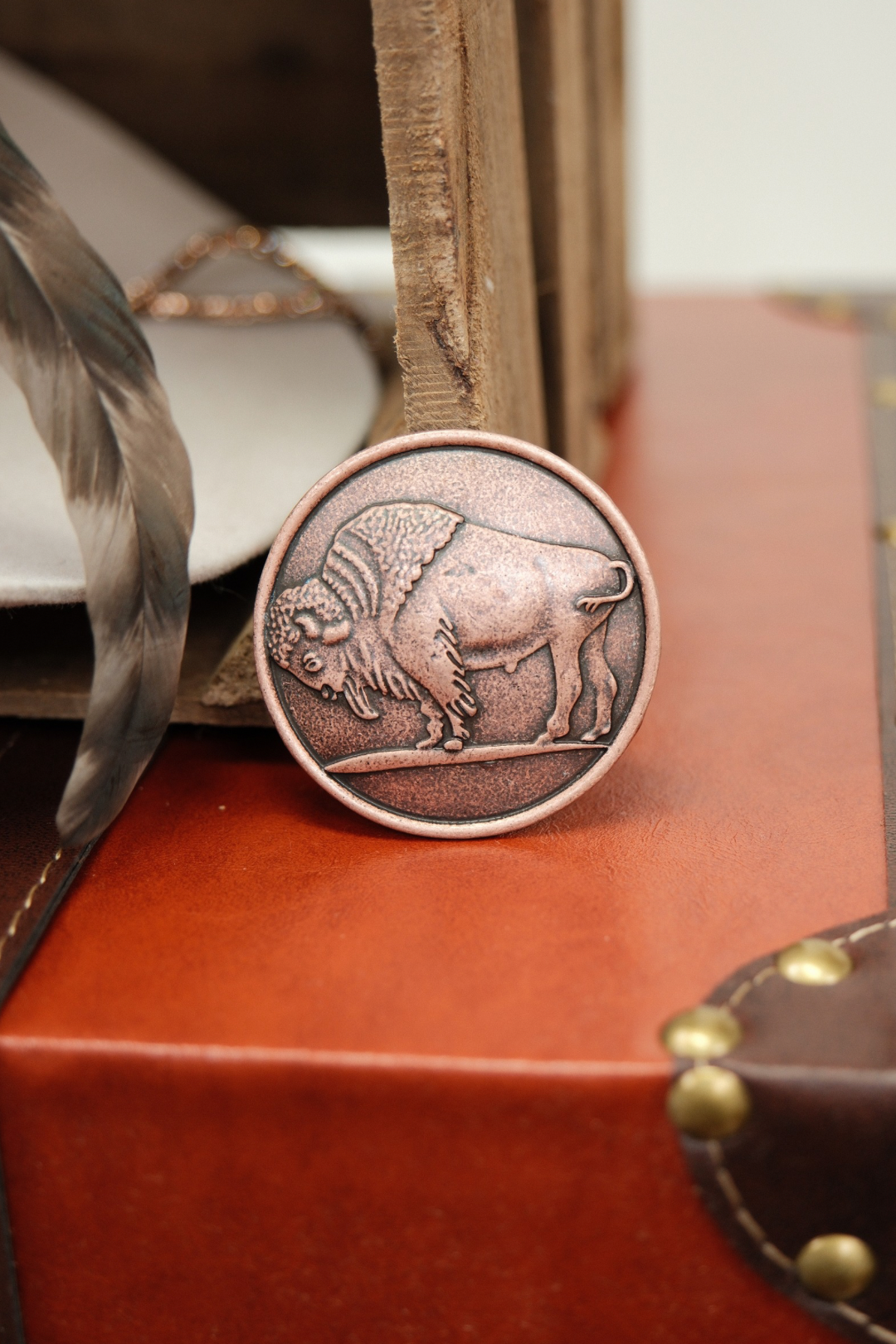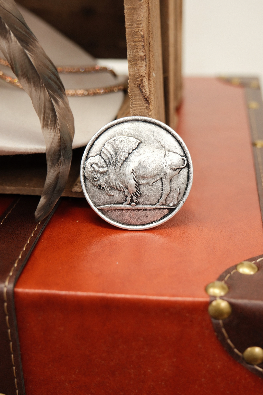 Bring a little history to your wild rag with the Buffalo Nickel Scarf Brooch—a bold, trend-forward accessory made to clip perfectly onto our leather scarf slides. Inspired by the iconic American buffalo coin, this piece adds a rustic, vintage flair to your western wardrobe. Whether you're styling for a rodeo, market day, or photoshoot, this brooch brings instant character and a nod to classic Americana.