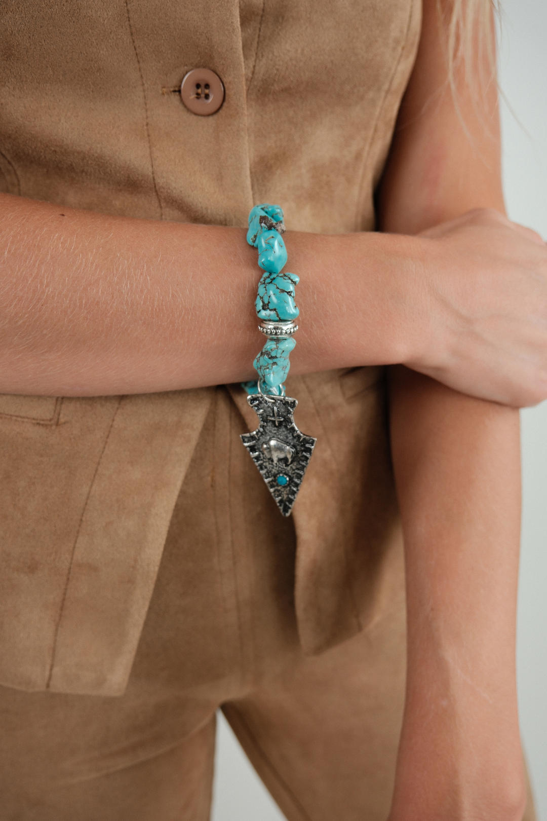Embrace the essence of the West with the Buffalo Spirit Turquoise Nugget Bracelet. Hand-strung with genuine turquoise nuggets, this bracelet features a detailed buffalo arrow charm symbolizing strength, freedom, and the open plains. The natural variations in the turquoise make each piece one-of-a-kind, adding rustic charm to your look whether you’re at the rodeo, out on the town, or simply channeling your inner cowgirl spirit.