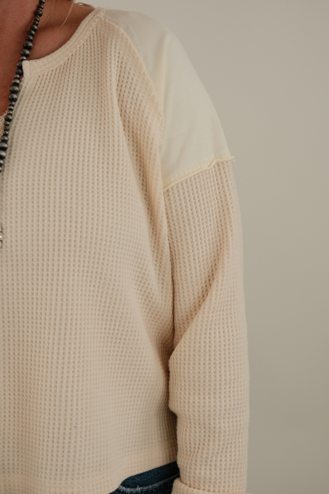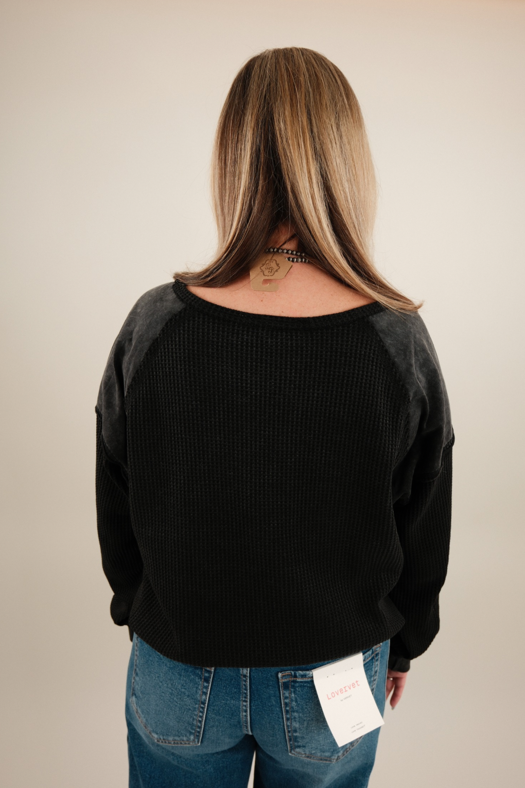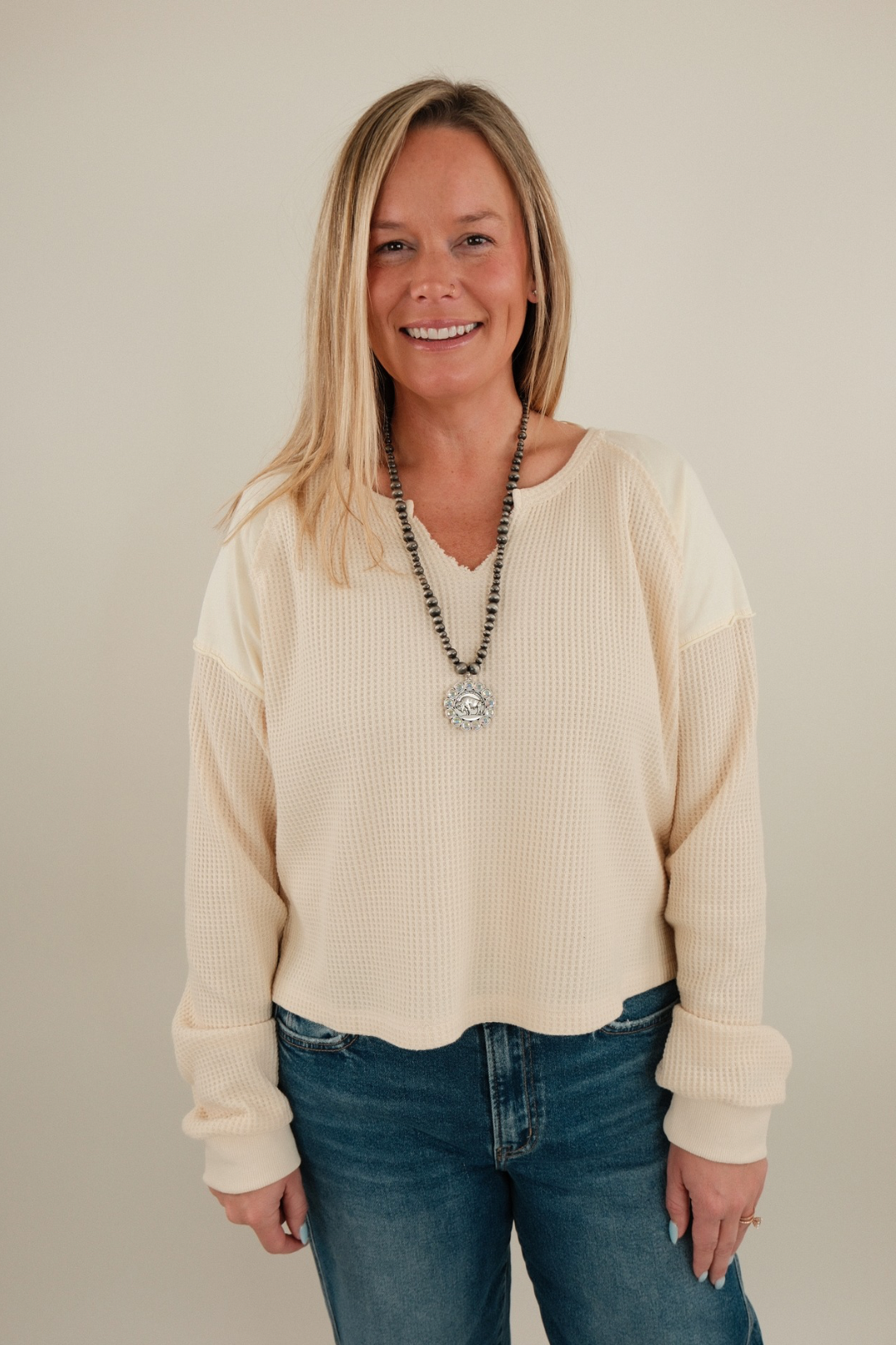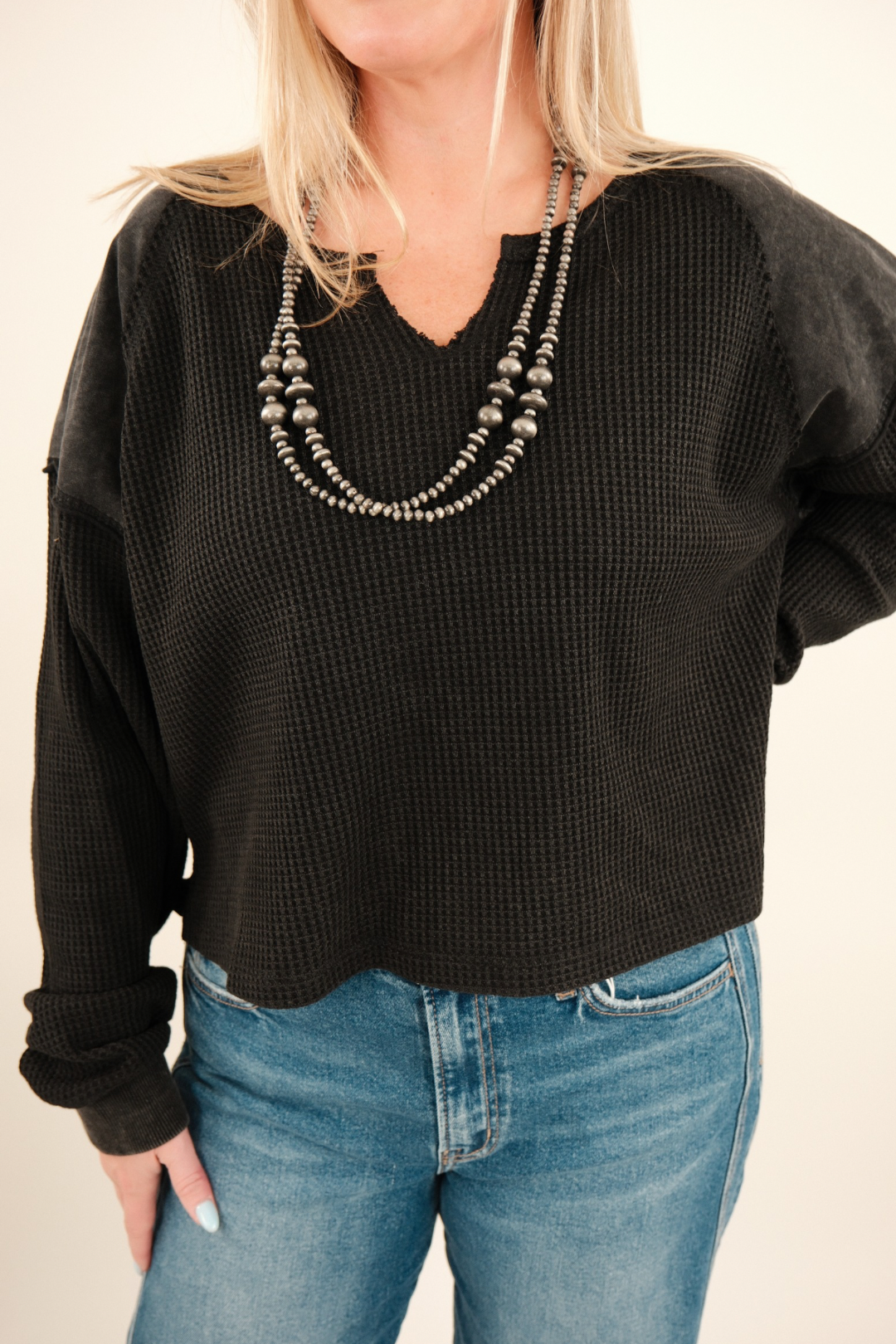 The Canyon Wash Thermal Top is a versatile western essential with a touch of rugged charm. Crafted in a snow-washed thermal knit, this slightly cropped top features a notched neckline for a laid-back finish and contrasting cotton shoulder patches that add both texture and durability.