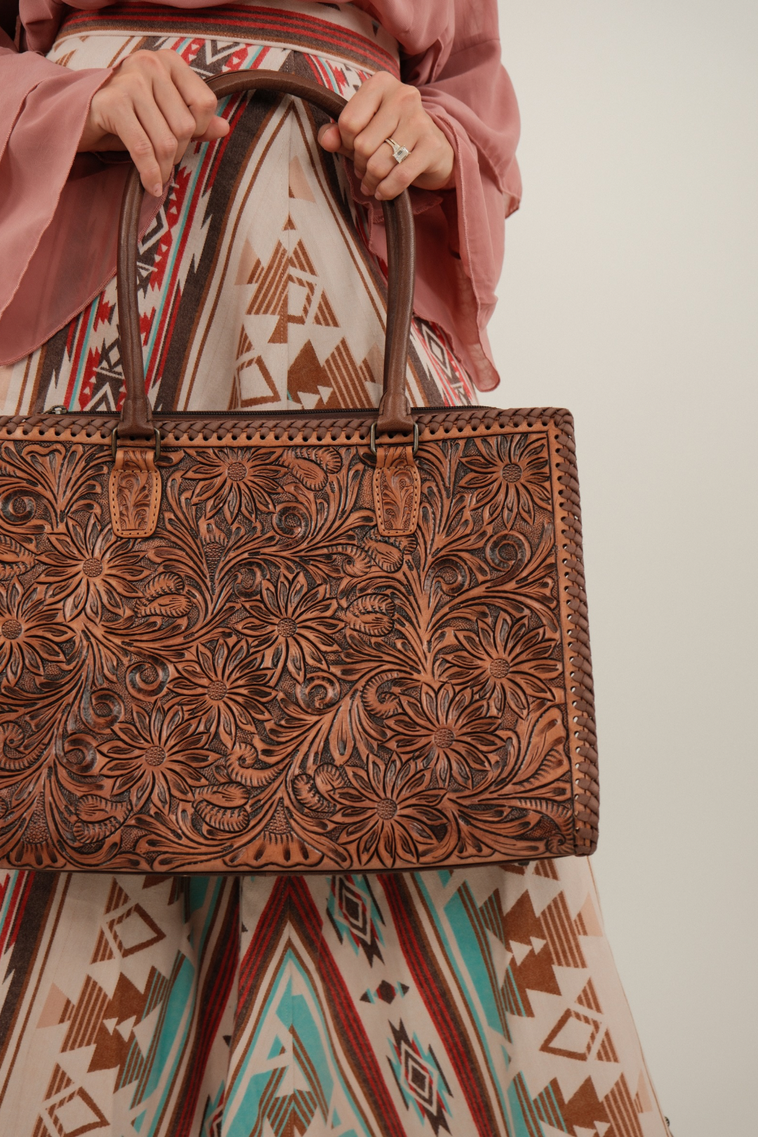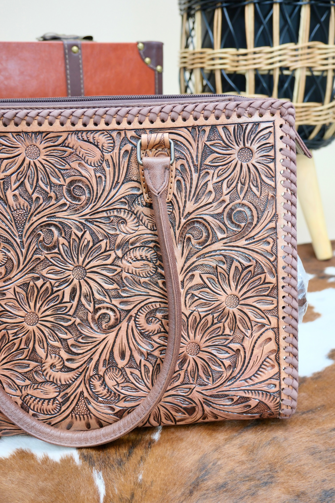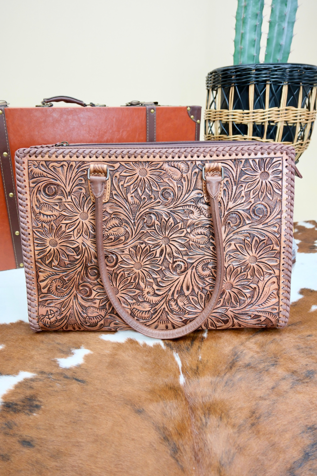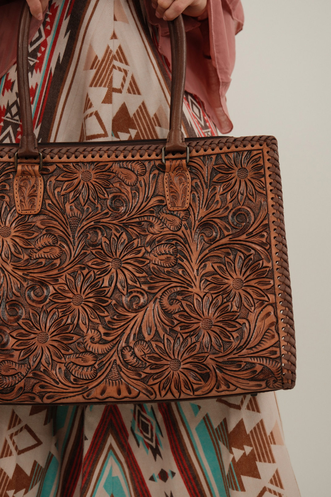 The Cimarron Ridge Concealed Carry Tote is the perfect blend of western craftsmanship and everyday utility. Made from 100% genuine leather, this 17" x 12" masterpiece showcases hand-tooled floral designs across the front and intricate leather braided edges that embody true artisan detail.