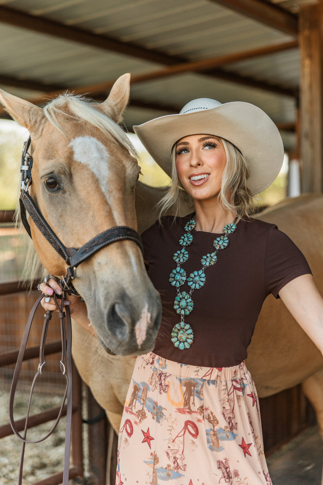Slip into effortless western-casual with the Cocoa Canyon Baby Tee. This short sleeve essential is crafted in a rich dark brown hue that gives off just the right amount of desert charm. Designed with a flattering fitted silhouette and double-lined for smoothing support, this tee hugs in all the right places while keeping comfort front and center.