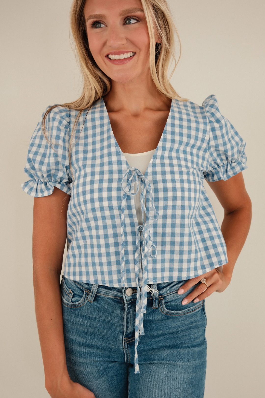 This Country Plaid Tie-Front Top is the ultimate country chic piece for any Western wardrobe with its blue and white plaid. Featuring an open front with stylish tie details, it offers a customizable fit that flatters all body types. The short sleeves are designed with elastic to create a trendy bubble sleeve, giving it a playful yet sophisticated touch. Perfect for casual outings or rodeo events, this top pairs beautifully with jeans and cowboy boots, making it a must-have for your Western-inspired look.