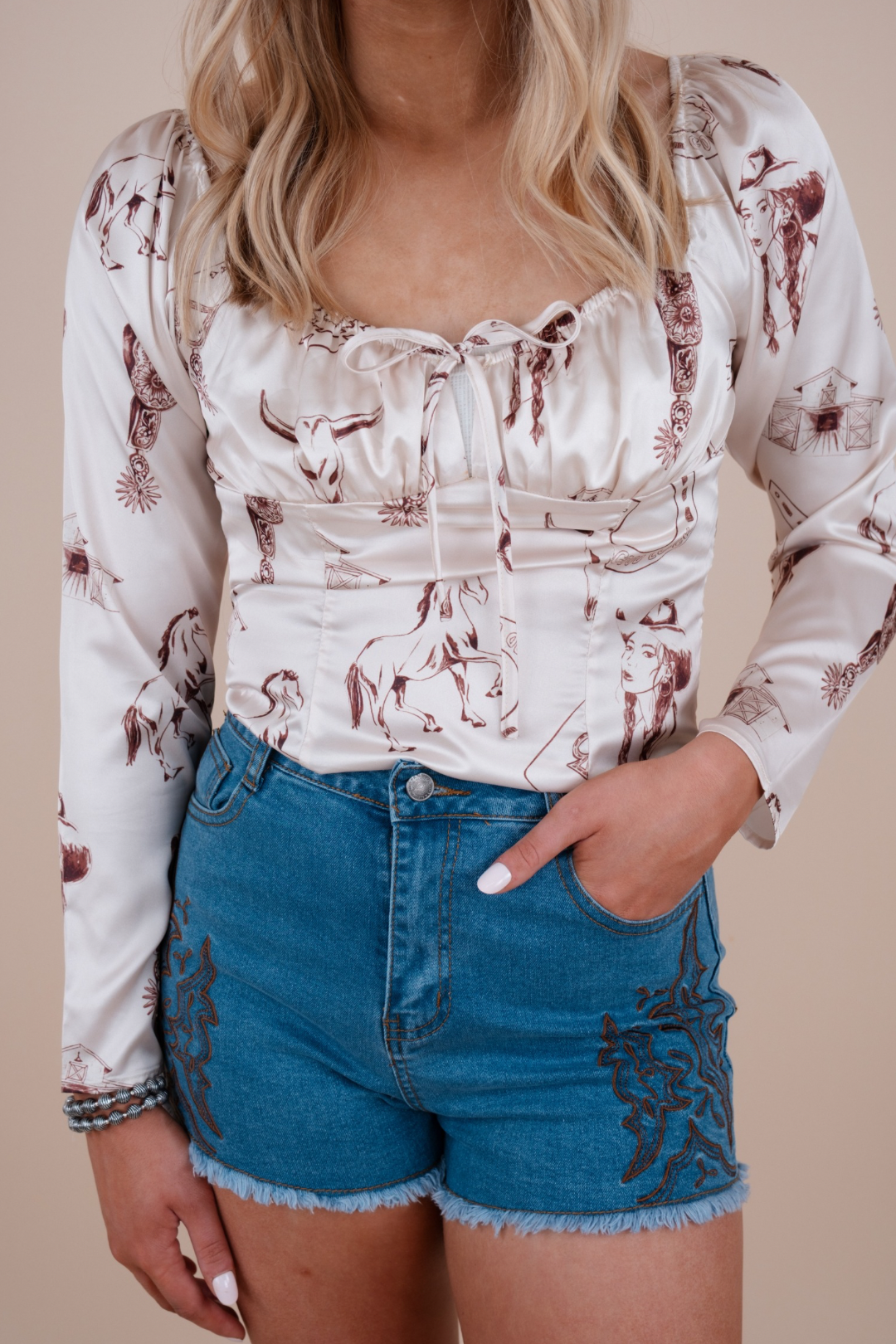 This Cowboy Charm Silk Top is the ultimate rodeo-ready piece! Featuring a beautiful cream color with a brown western print, it combines comfort and style with a western flair. The elastic rounded neckline can be worn off the shoulders for a chic, relaxed look. The front ties at the neckline add a playful, detailed touch, while the back tie creates an adjustable fit. With long sleeves and a lightweight silk fabric, this top is perfect for layering or wearing on its own. Pair it with your favorite jeans, cowboy boots, and a cowboy hat, and you're all set for a fun day at the rodeo or a western-inspired outing!
