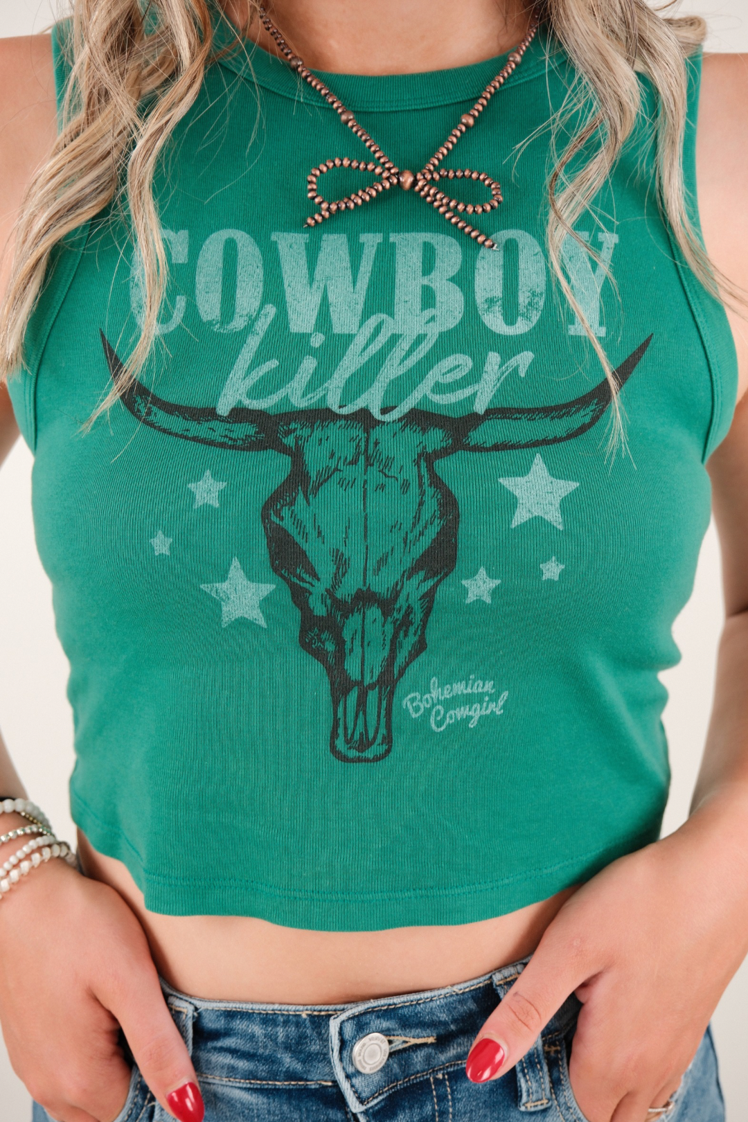 Unleash your wild side with the Cowboy Killer Racerback Tank—a fierce and flirty essential for every modern cowgirl. This sage green tank features a striking black bull skull graphic surrounded by stars and the bold phrase “Cowboy Killer.” With a flattering racerback cut and a buttery soft feel, this tank is built for long days under the sun and rowdy nights out west.