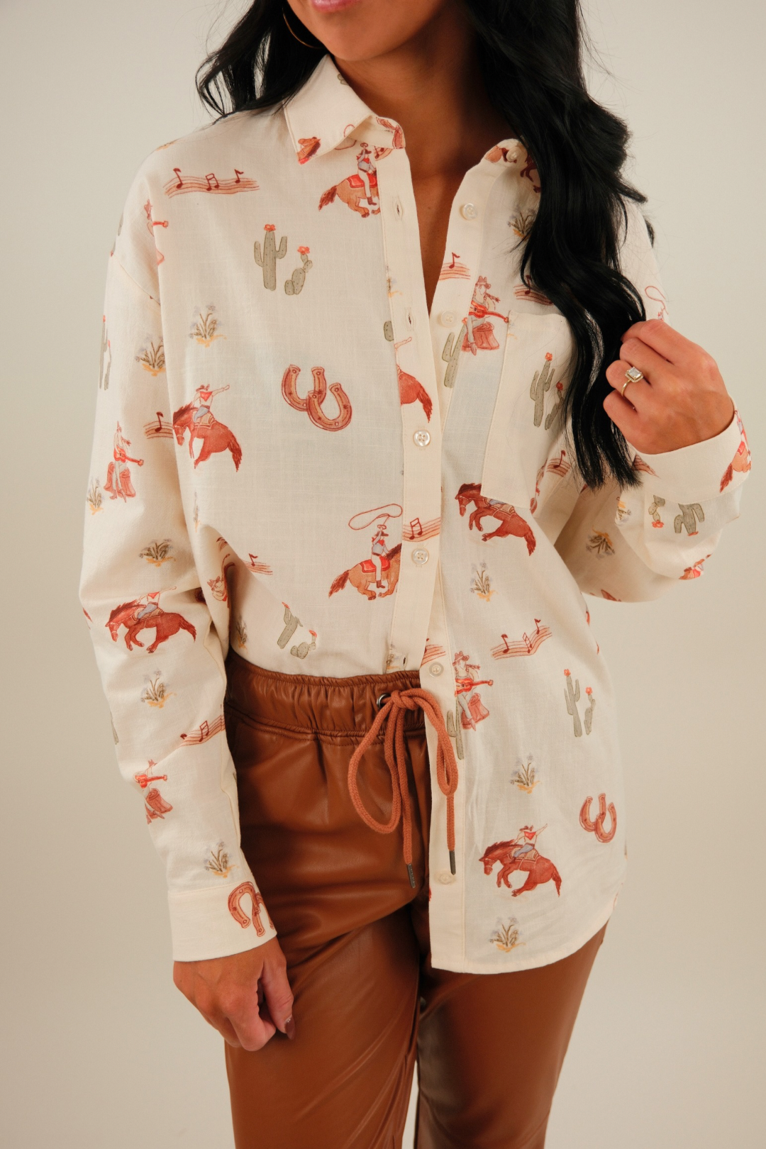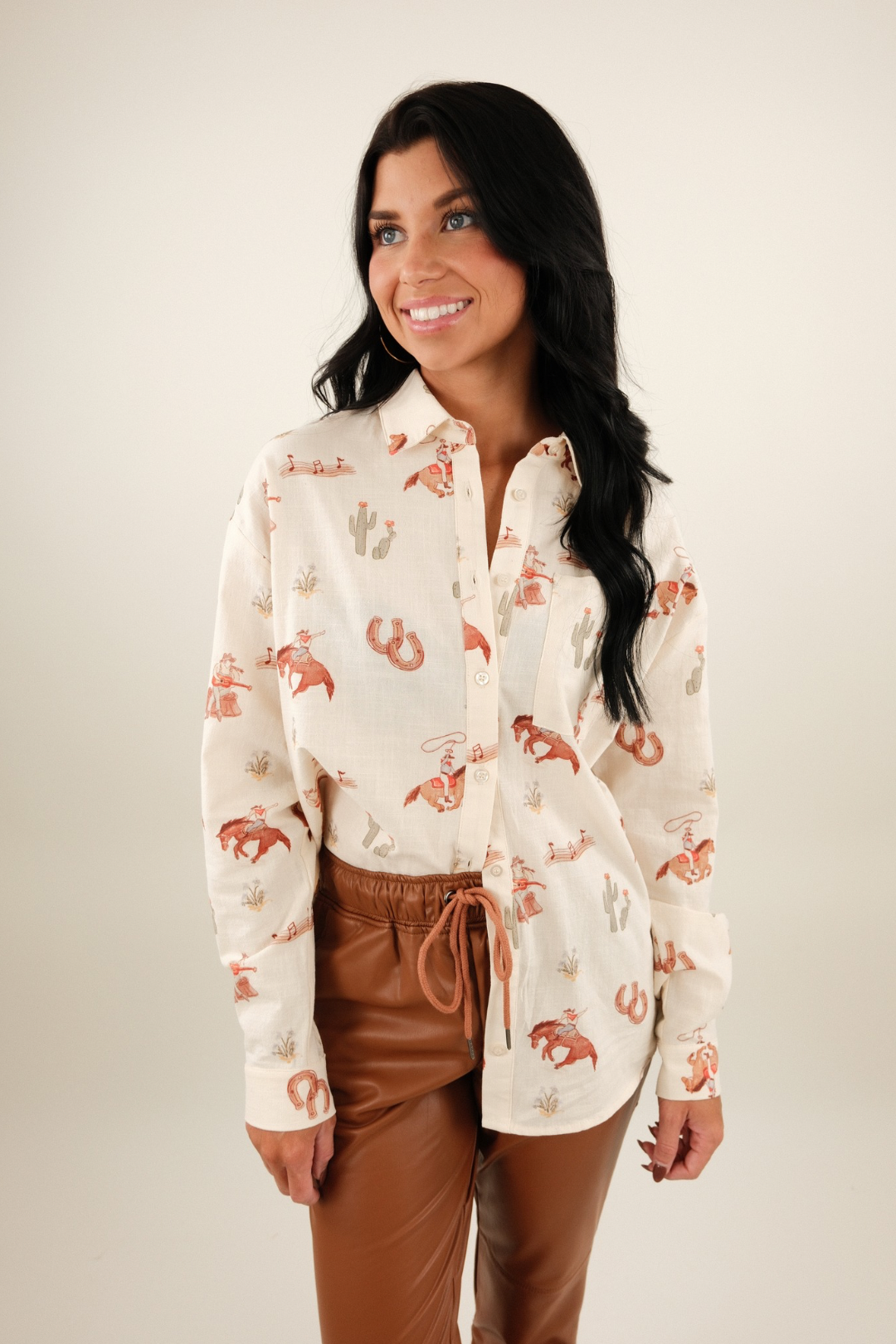 Bring a touch of vintage western charm to your wardrobe with the Cowboy Serenade Cotton Blouse. Made from 100% breathable cotton, this cream button-down features an allover print of western motifs — from cacti and horseshoes to guitar-strumming cowboys and bucking broncs. With its collared neckline, long sleeves, and classic silhouette, this blouse blends rodeo spirit with everyday wearability, making it perfect for pairing with denim, skirts, or layered under vests.