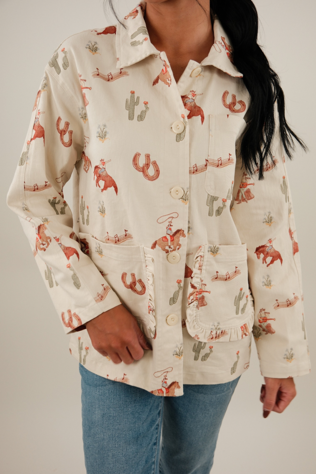 Add a touch of western storytelling to your layers with the Cowboy Serenade Cotton Jacket. Made from 100% breathable cotton in cream, this long-sleeve button-down features a lively print of cacti, bucking horses, guitar-playing cowboys, music notes, and horseshoes. Finished with a collared neckline and three functional pockets — one at the chest and two lower front pockets trimmed with ruffled edges — this jacket blends utility with playful cowgirl charm. Perfect for layering over denim, dresses, or the matching blouse for a coordinated look.