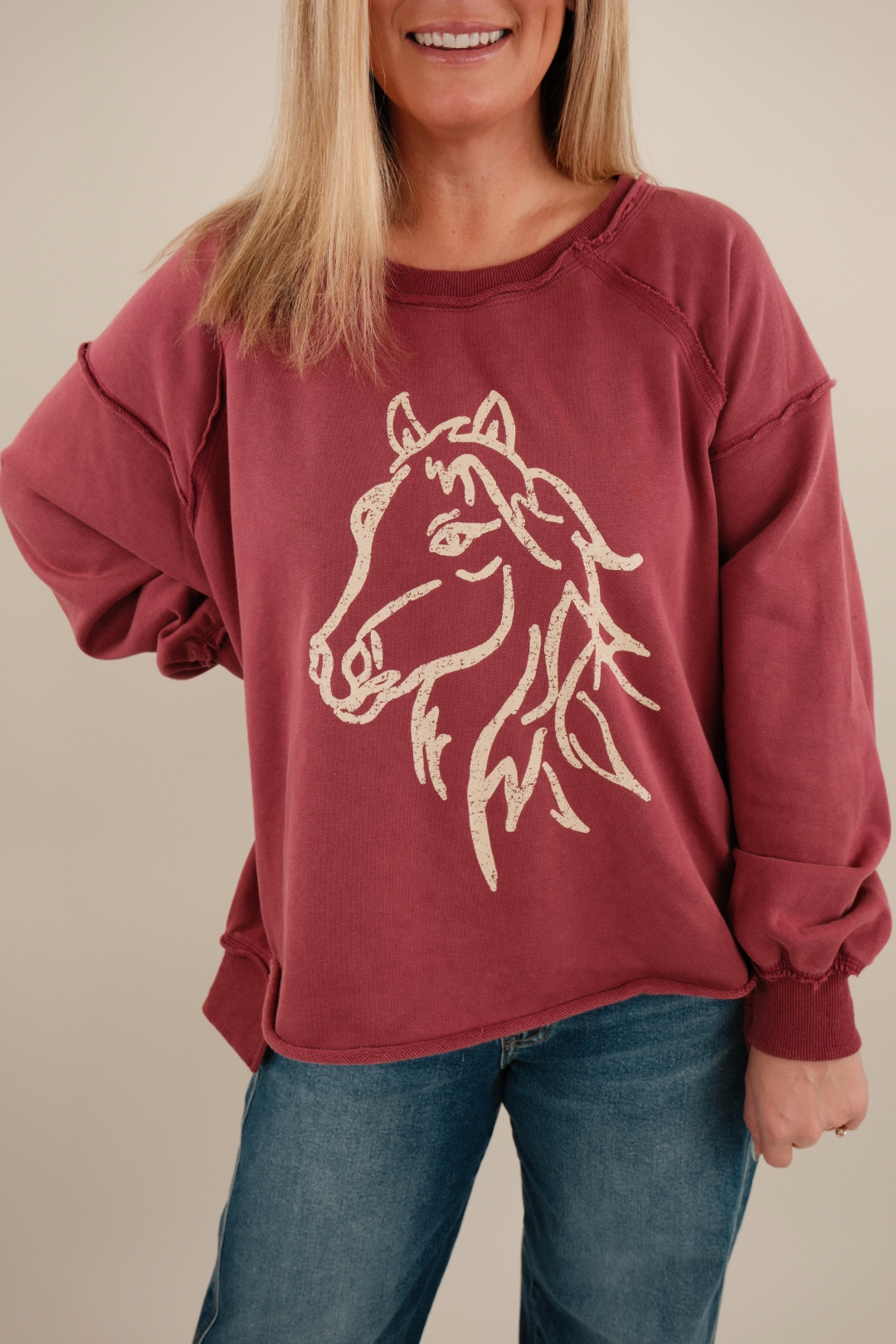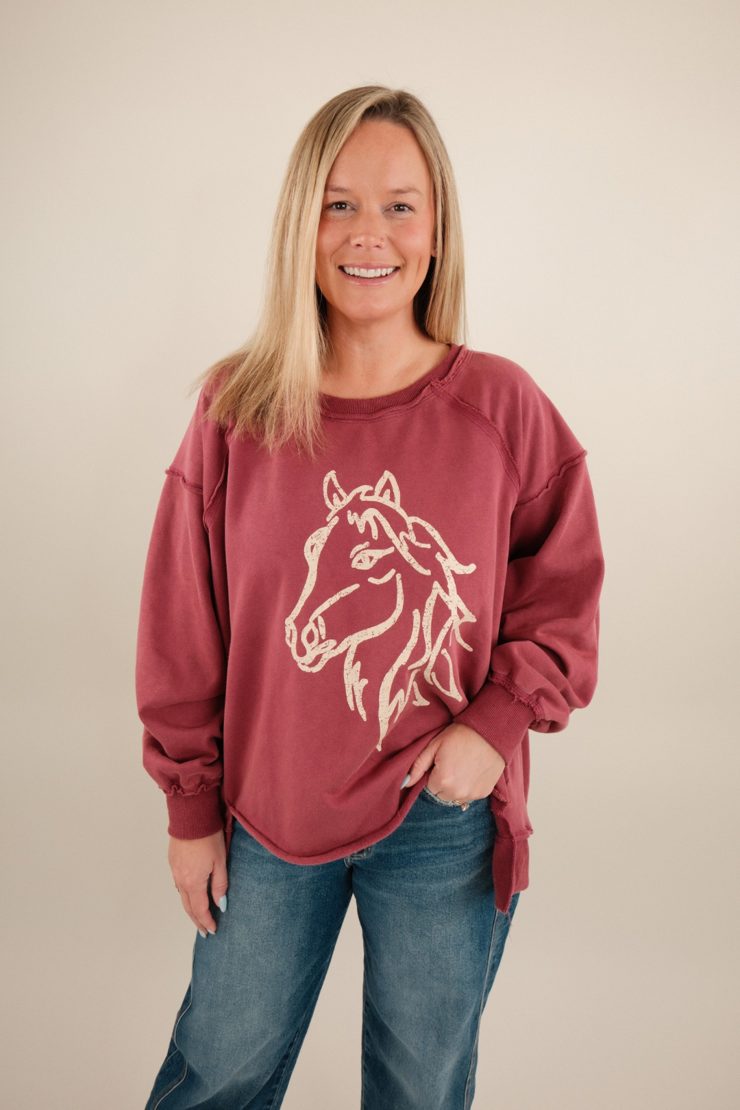 Cozy meets cowgirl in the Cowgirl Comfort Crewneck. Designed in a rich raspberry hue, this oversized pullover has a slouchy, relaxed fit that’s perfect for everyday wear. The front features a bold cream horse head graphic, giving it a western edge while keeping the vibe casual and easy to style.