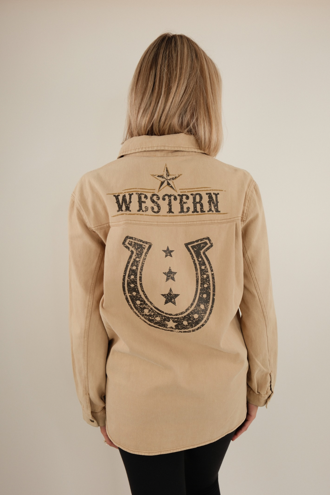 The Cowgirl Legacy Shacket - where classic western charm meets modern comfort in this soft washed tan button-down shacket. Crafted with a lived-in texture and slightly oversized fit, this piece layers effortlessly over tees, dresses, or sweaters for year-round wear. The standout detail is on the back — a bold brown horseshoe and star graphic crowned with the word “Western” — celebrating rugged spirit with a feminine edge. Finished with a traditional collar and button closures, it’s the perfect piece to throw on for rodeo nights, ranch weekends, or laid-back outings.