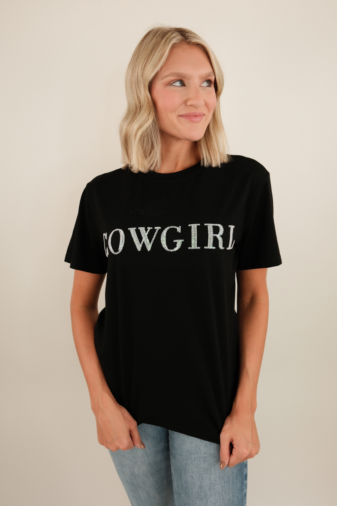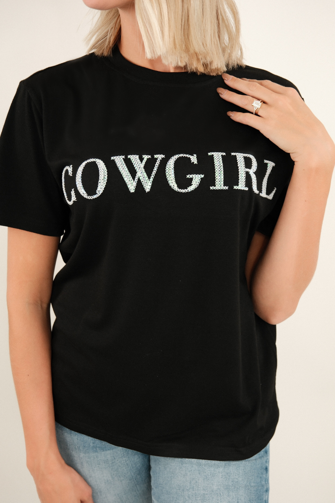 The Cowgirl Spark Tee takes a wardrobe basic and gives it a dazzling western upgrade. Crafted from ultra-soft black fabric, this classic tee is elevated with the word “COWGIRL” across the chest in shimmering sequins, finished with delicate embroidery for a boutique-level touch.