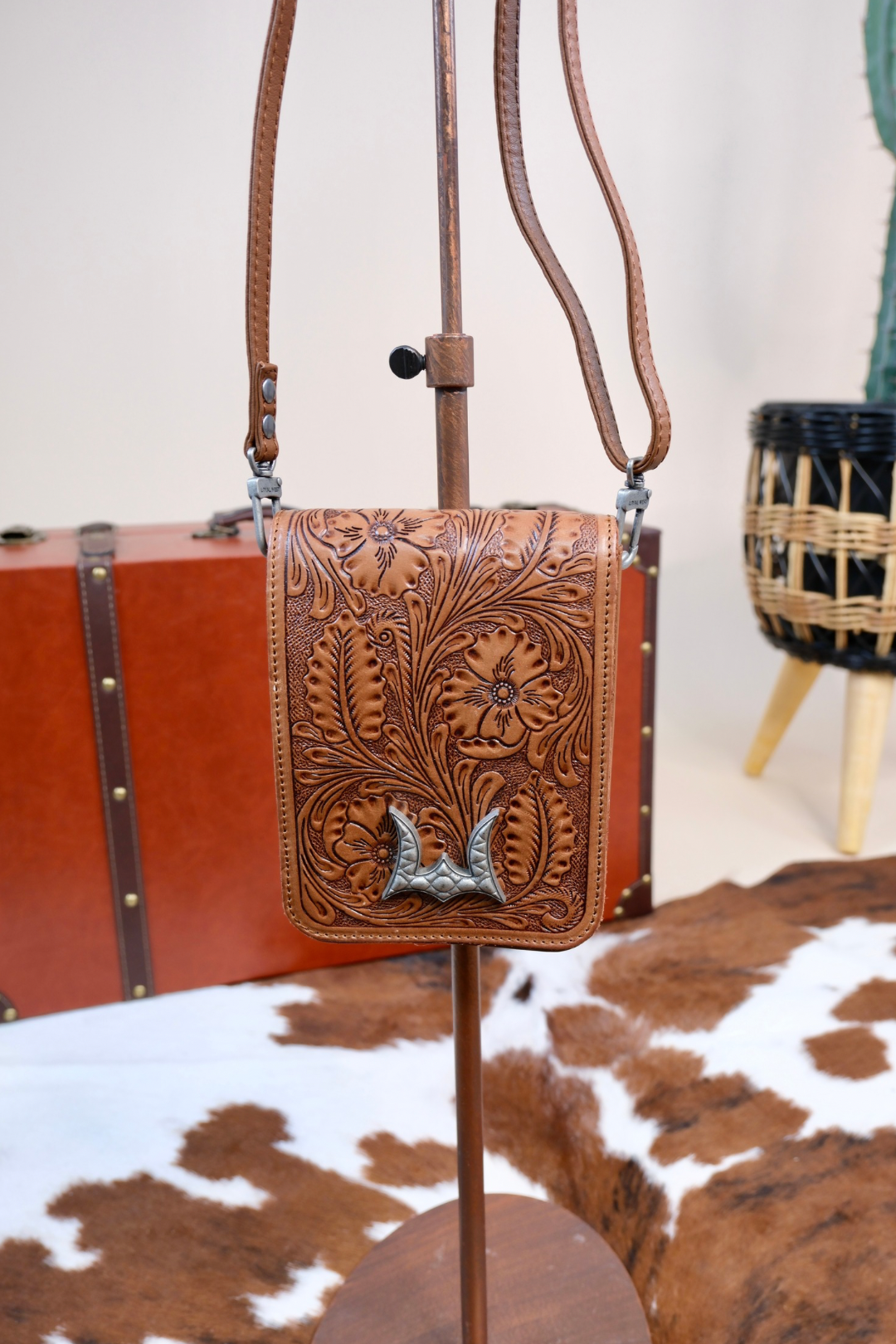 The Coyote Moon Mini Purse may be small, but it makes a bold statement with every stitch. Made from genuine leather and finished with intricate hand-tooled designs, this compact beauty is the perfect grab-and-go accessory for cowgirls on the move.