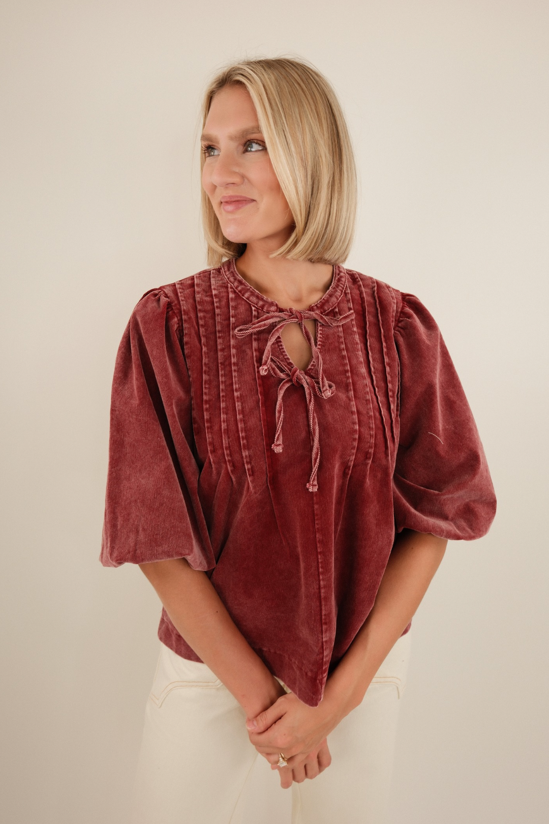 The Cranberry Canyon Blouse is a romantic take on western-inspired style. Crafted from soft washed corduroy in a rich cranberry hue, this blouse features smocked detailing across the top for comfort and texture. A deep v-neckline is secured with two delicate ties, adding a touch of vintage charm while keeping the look effortlessly chic.