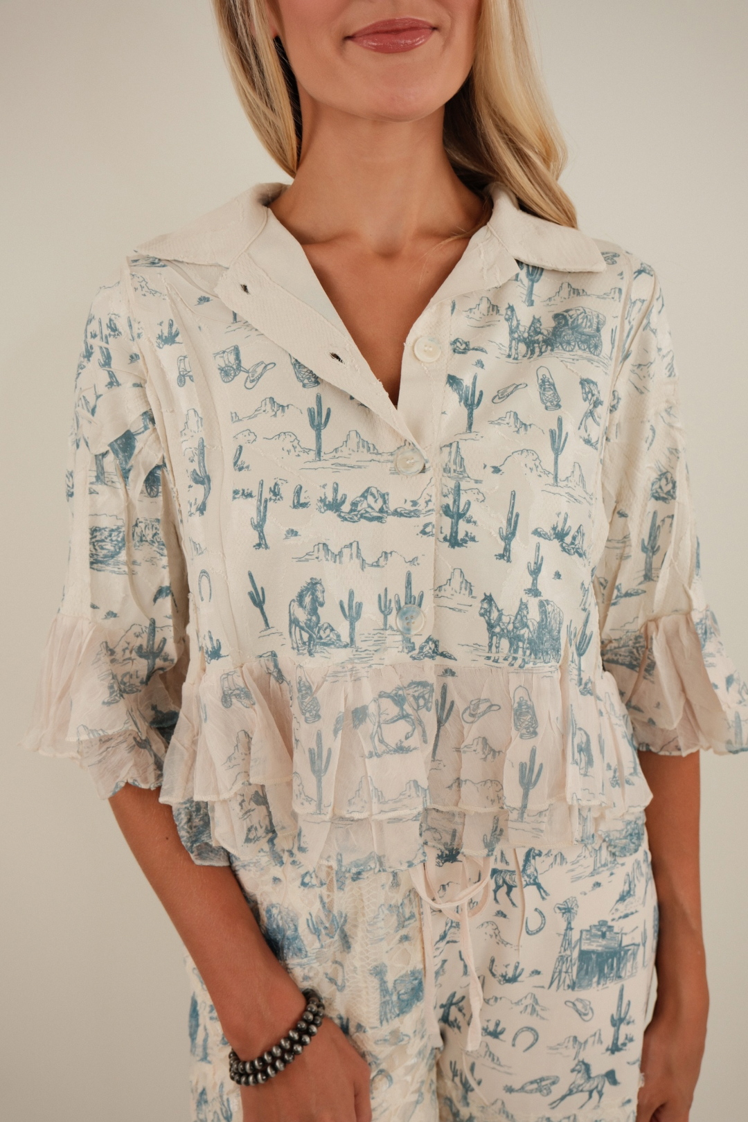 Feminine western flair takes center stage in the Desert Belle Jacket. This cropped cream-toned beauty features an old-school blue western print that captures the soul of the dusty plains. Delicate lace overlays and dramatic ruffle sleeves add a romantic touch, blending vintage charm with modern cowgirl attitude. Whether you’re pairing it with high-rise denim or throwing it over a simple dress, this jacket is a statement piece that turns every outfit into a frontier fantasy.