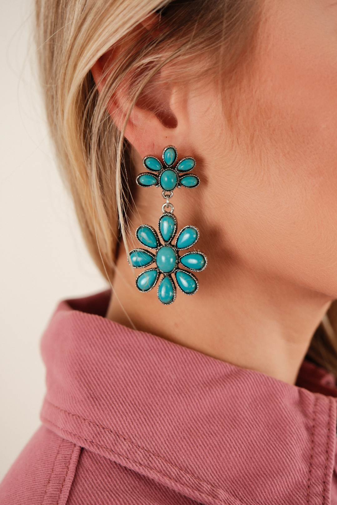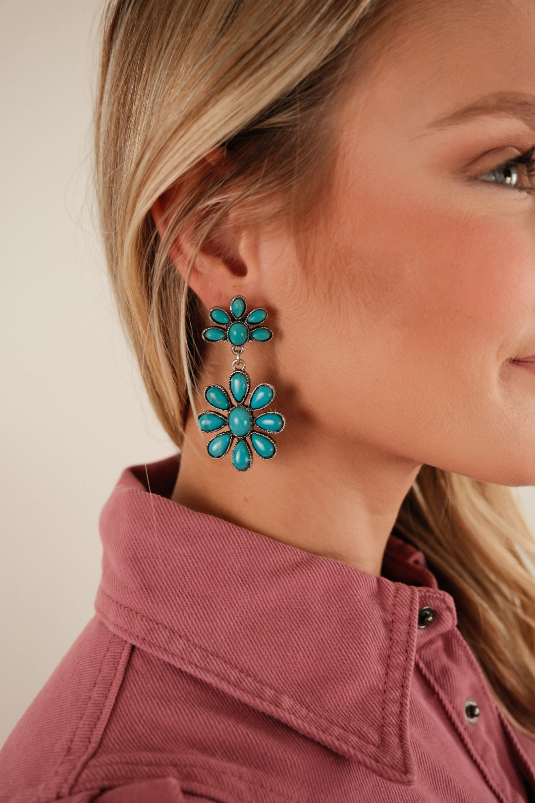 Bring a touch of Southwestern elegance to your look with our Desert Bloom Drop Earrings. Featuring a beautiful floral-inspired arrangement of stones, these earrings blend classic Western charm with modern flair. Available in rich turquoise or crisp white, each stone is set in a timeless silver-tone base that complements both everyday outfits and special-occasion styles. Lightweight yet eye-catching, they add the perfect pop of color and character to any ensemble.