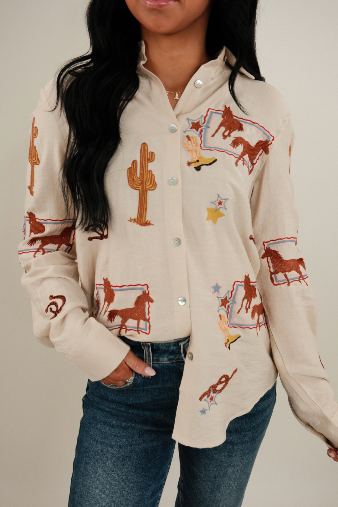 This long-sleeve button-down features a soft beige base covered in beautifully embroidered motifs — think galloping horses, shining stars, cowgirl boots, and cacti, all in cheerful shades of camel, yellow, blue, and light pink. With its collared neckline, button cuffs, and lightweight feel, this shirt transitions effortlessly from the arena to a night out.