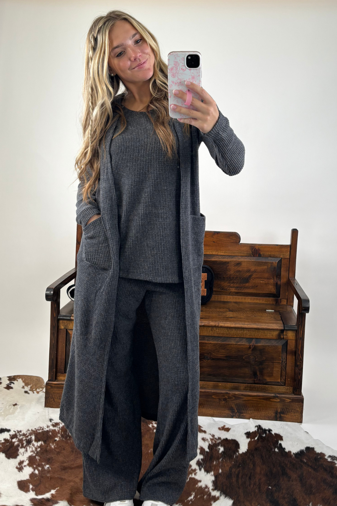 Step into effortless comfort with the Desert Dusk 3-Piece Thermal Lounge Set, your new go-to for cozy, elevated style this season. Crafted from a brushed thermal knit that feels dreamy against the skin, this set features a sleek sleeveless tank, a long flowy cardigan, and relaxed wide-leg pants—making it the perfect blend of lounge-ready ease and everyday polish.