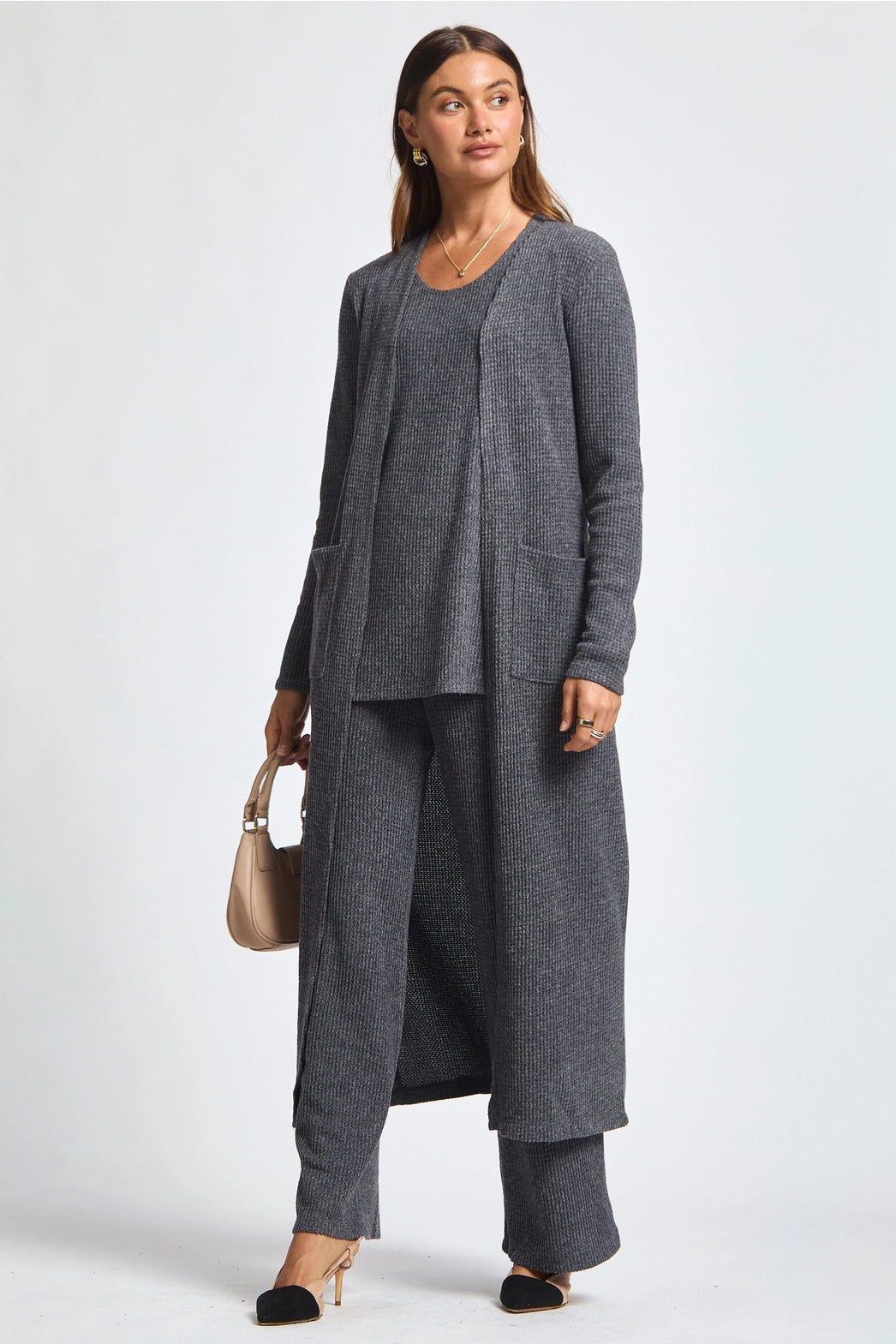 This versatile trio layers beautifully, offering a flattering silhouette that moves with you whether you're running errands, lounging at home, or styling it up for a casual day out. The longline cardigan adds chic movement, the tank provides breathable comfort, and the matching pants bring a relaxed yet put-together vibe.