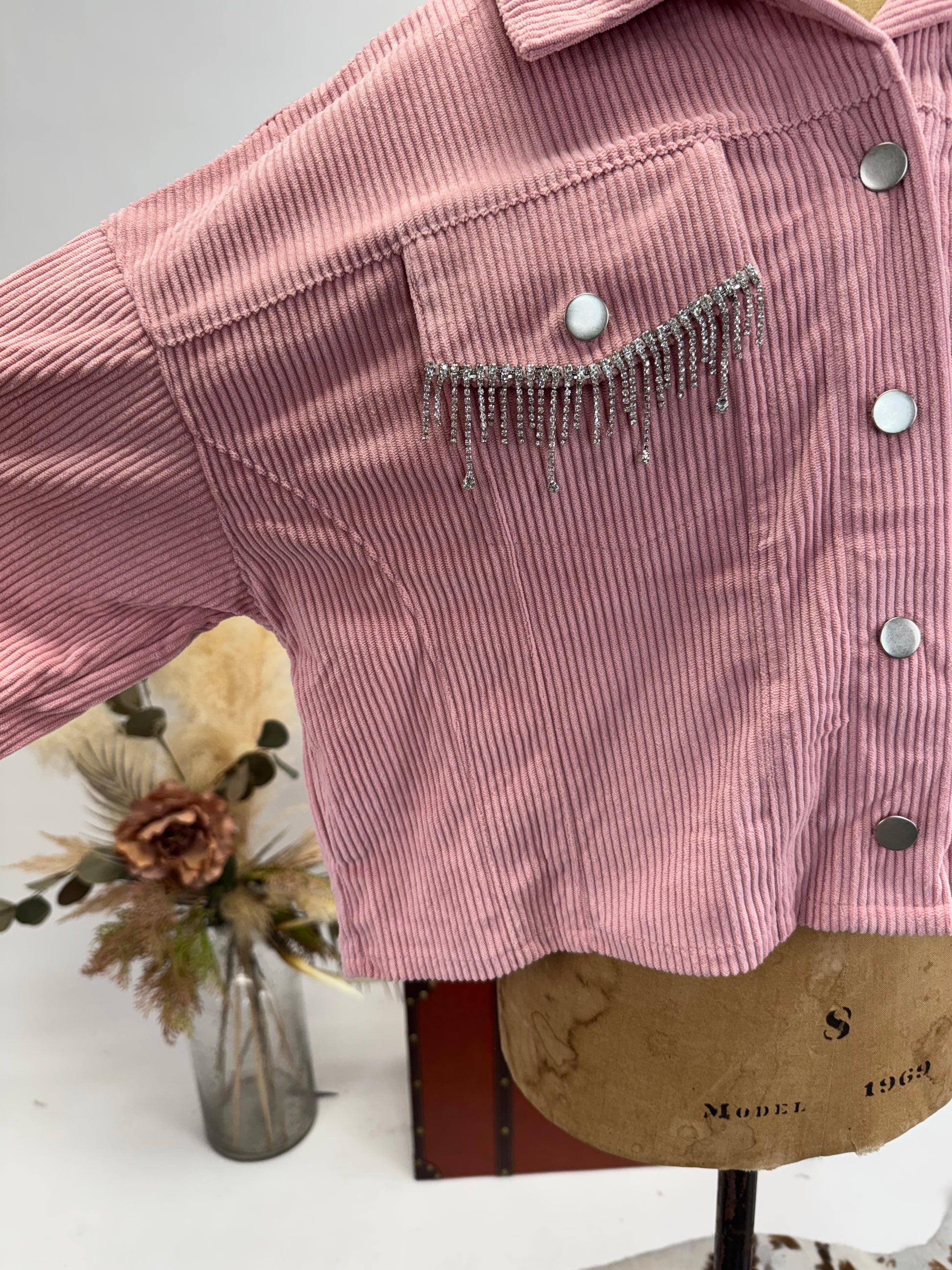 Add a touch of glam western flair to your wardrobe with the Diamond Dust Rhinestone Fringe Jacket! Crafted from soft baby pink corduroy, this statement piece brings the perfect balance of sweet and sassy. The real showstopper? Sparkling rhinestone fringe draping from the front pockets, adding just the right amount of shimmer and movement.