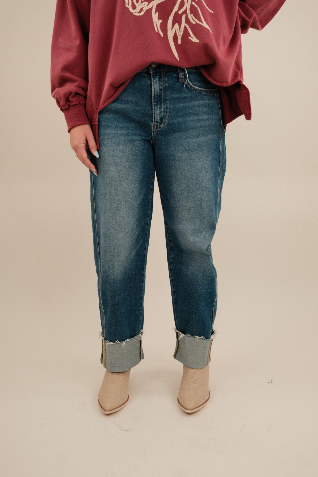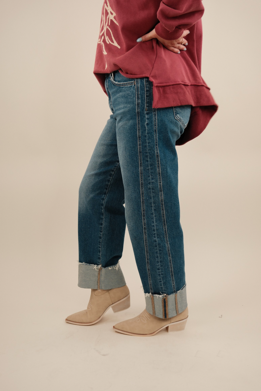 The Double Trail Barrel Jeans bring western structure to a trendy silhouette. Designed in a medium wash denim, these high-rise jeans feature a relaxed barrel leg with cuffed hems for a casual yet polished finish. Double seams run down each side of the legs, adding a tailored touch that elongates the silhouette while giving them a unique, elevated look.