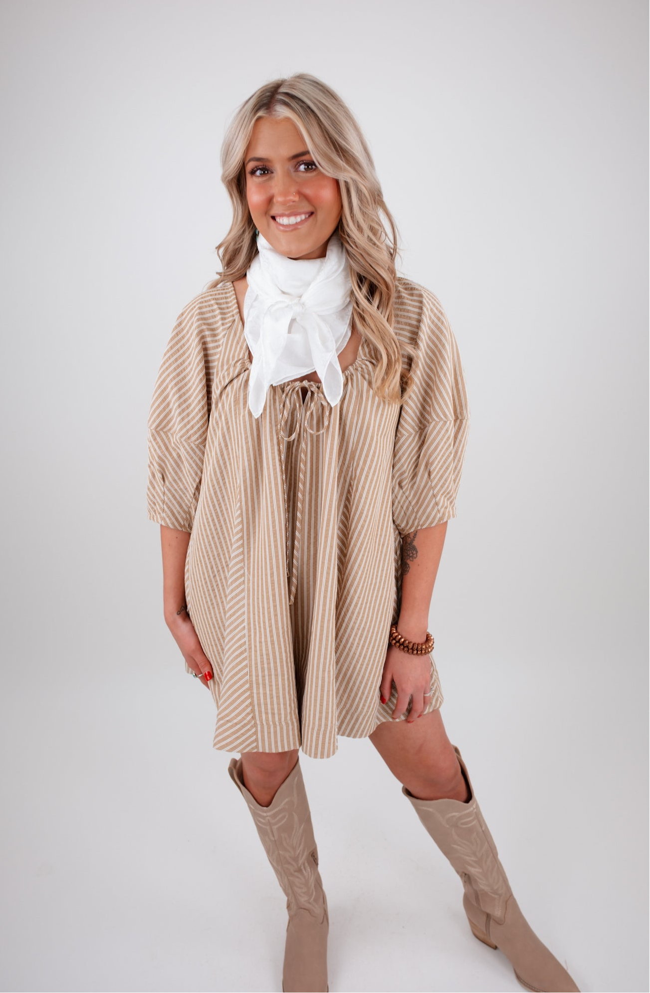 Breezy, bold, and made for sun-soaked strolls — the Dust & Daydreams Striped Romper is your new go-to for effortless western style. With its oversized easy fit and soft taupe hue kissed with crisp white stripes, this romper delivers both comfort and charm in one timeless silhouette.
