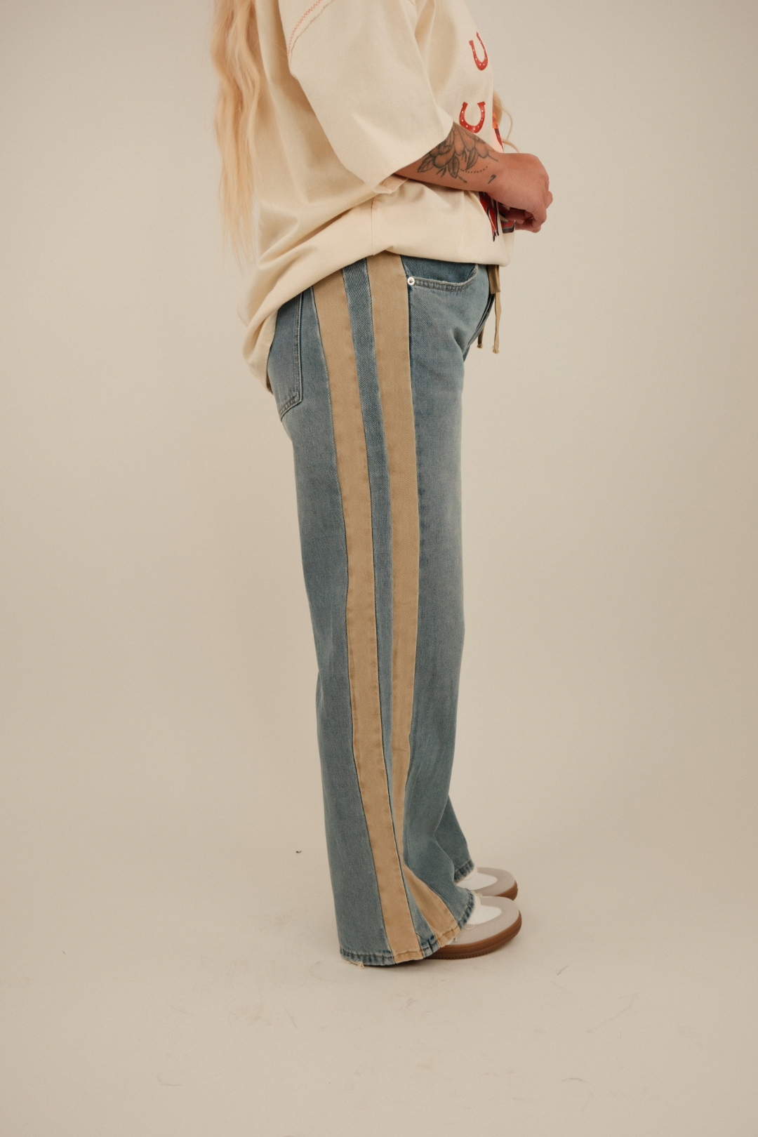 The Dusty Divide Drawstring Jeans blend laid-back comfort with bold western flair. These wide-leg jeans feature a soft drawstring waistband for a custom, relaxed fit—perfect for cowgirls on the move. Beige side panels and matching contrast back pockets add a stylish two-tone edge, making these a standout staple in your denim lineup.