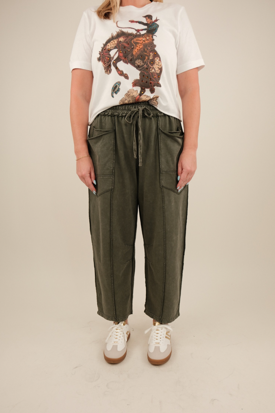 The Dusty Mesa Barrel Pants are where comfort meets cowgirl cool. Crafted from soft terry knit with a mineral wash finish, these pull-on pants feature a relaxed barrel-leg silhouette that blends laid-back ease with modern western edge. A drawstring waist ensures the perfect fit, while double front pockets add both function and style.
