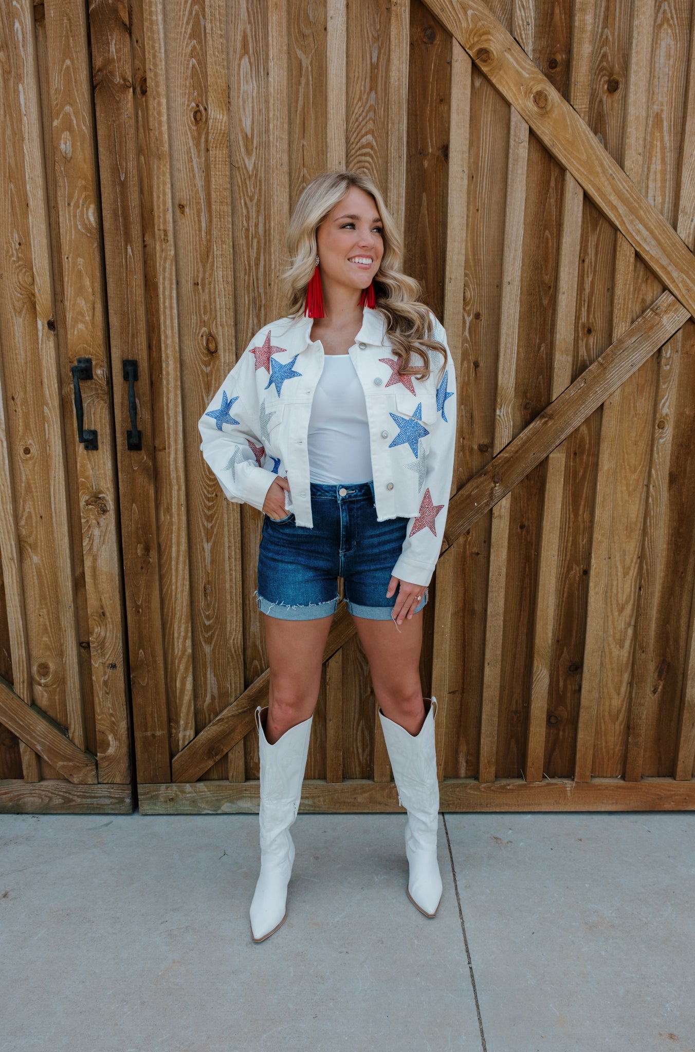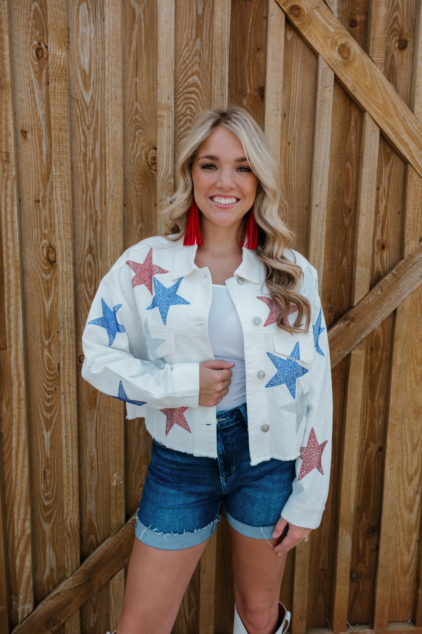 Whether you're headed to a parade, rodeo, or fireworks at dusk, this jacket will light up your outfit with star-spangled sparkle.