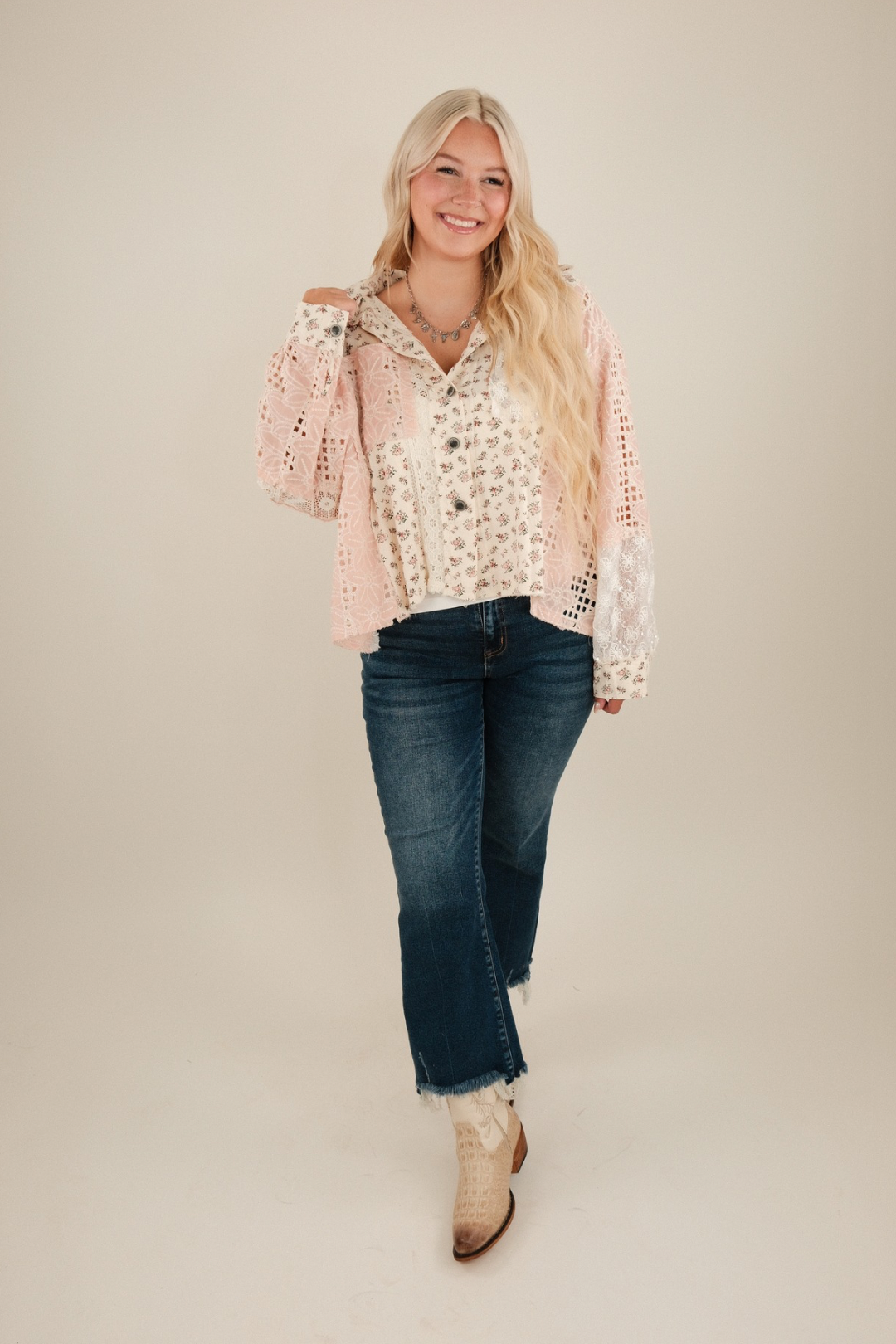 Step into spring with this stunning Floral Finesse Shacket, designed to keep you stylish and comfortable. The cream-colored fabric is beautifully adorned with a vibrant blend of pink, burgundy, and green flowers, complemented by delicate pink floral stitching detail. A white mesh floral pattern and cream stitching add texture and visual interest, making this shacket a standout piece for any spring wardrobe. Featuring a classic collar, chest pockets, and a button-down front, it offers both style and practicality. The high-low hemline adds a modern twist, making this shacket perfect for layering over your favorite outfits.