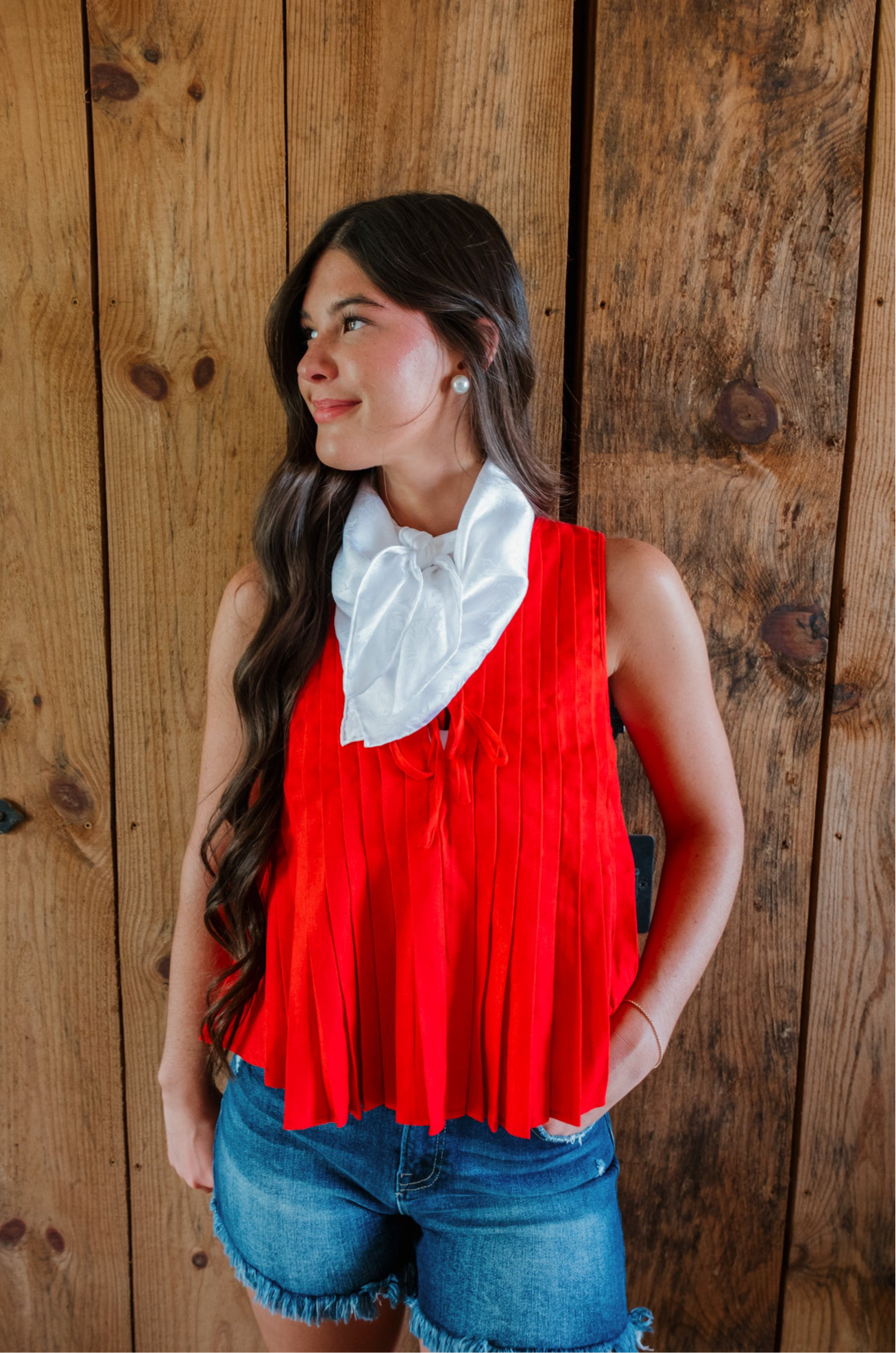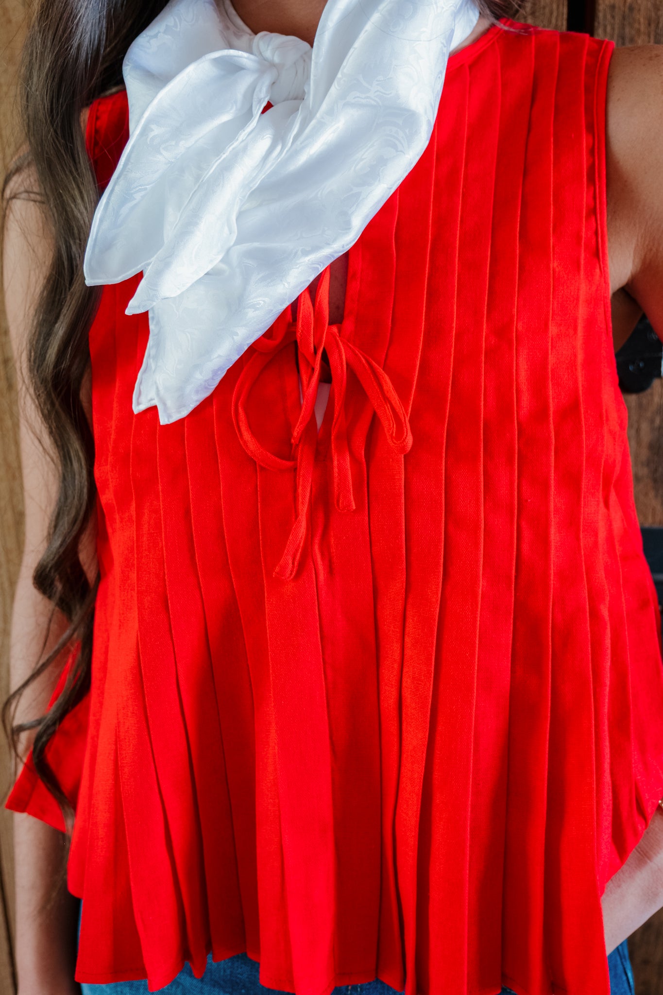 Celebrate summer in standout style with the Freedom to Bow Linen Top – the ultimate blend of playful charm and patriotic flair. This vibrant red top is crafted from lightweight, breathable linen and features dainty pleats for texture and movement. Its sleeveless, cropped silhouette keeps things cool, while two oversized front bows steal the show — fully adjustable for your ideal fit. Whether you're pairing it with high-waisted denim or a flowy skirt, this top is ready for fireworks, BBQs, and twirling under the stars.