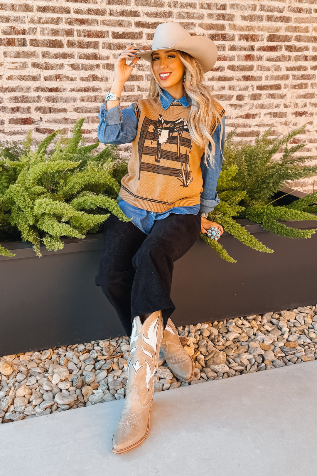 This camel brown sweater vest features contrasting black trim along the neckline, armholes, and hem for a polished, tailored finish. Across the chest, a fence and saddle motif nods to life on the ranch — making this piece as nostalgic as it is stylish. Crafted from soft, medium-weight knit, it layers effortlessly over blouses, button-downs, or dresses for year-round wear.