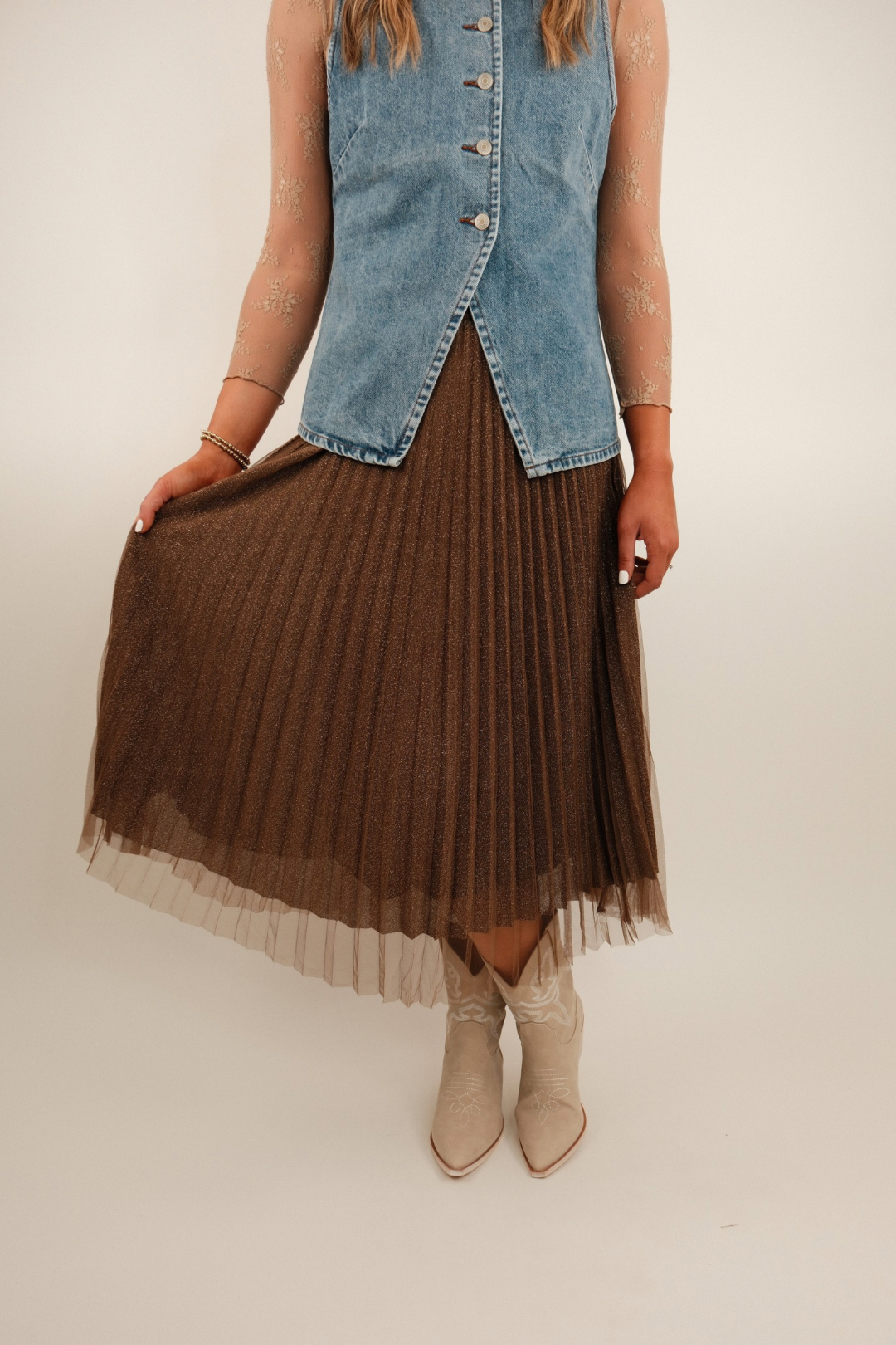 Shimmer under the western lights with the Golden Dust Pleated Skirt, a midi-length statement piece that blends effortless elegance with cowgirl glam. Crafted in a rich brown hue with gold glitter woven throughout, this skirt catches the light with every step. A delicate pleated tulle overlay adds dimension and movement, creating a dreamy layered effect.