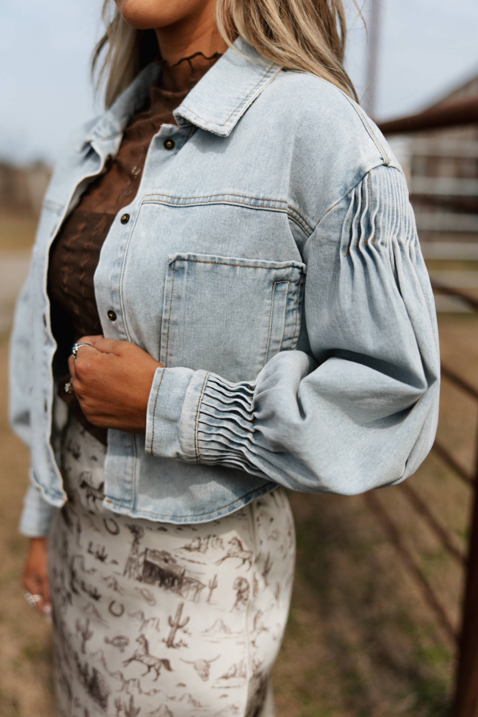 Crafted from light wash denim, this lightweight piece can be worn as a shirt or layered as a jacket, giving you endless outfit options. Thoughtful pleating at the shoulders and wrists adds a feminine touch, while the brushed gold snap buttons bring that subtle western shine. Finished with two oversized front pockets, this cropped cut flatters every figure — from jeans and boots to maxi skirts and hats.