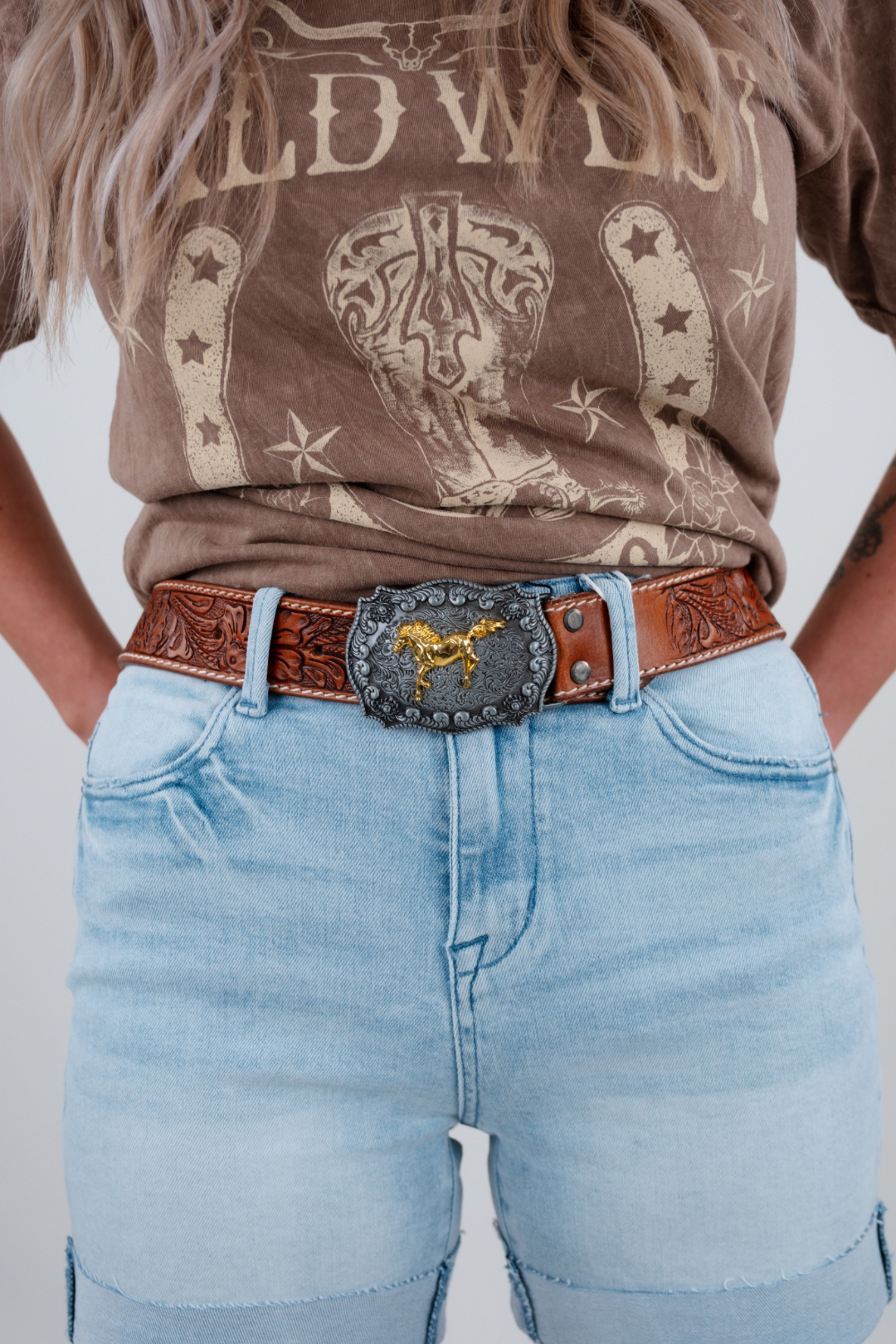 Make a statement with the Golden Reins Western Belt—a striking piece that blends tradition with flair. This XL 45-inch genuine leather belt is beautifully hand-tooled with classic western scrollwork, offering craftsmanship that speaks for itself. At the center is a large silver buckle featuring a raised gold horse, delivering show-stopping detail that draws the eye and honors the heart of the West.