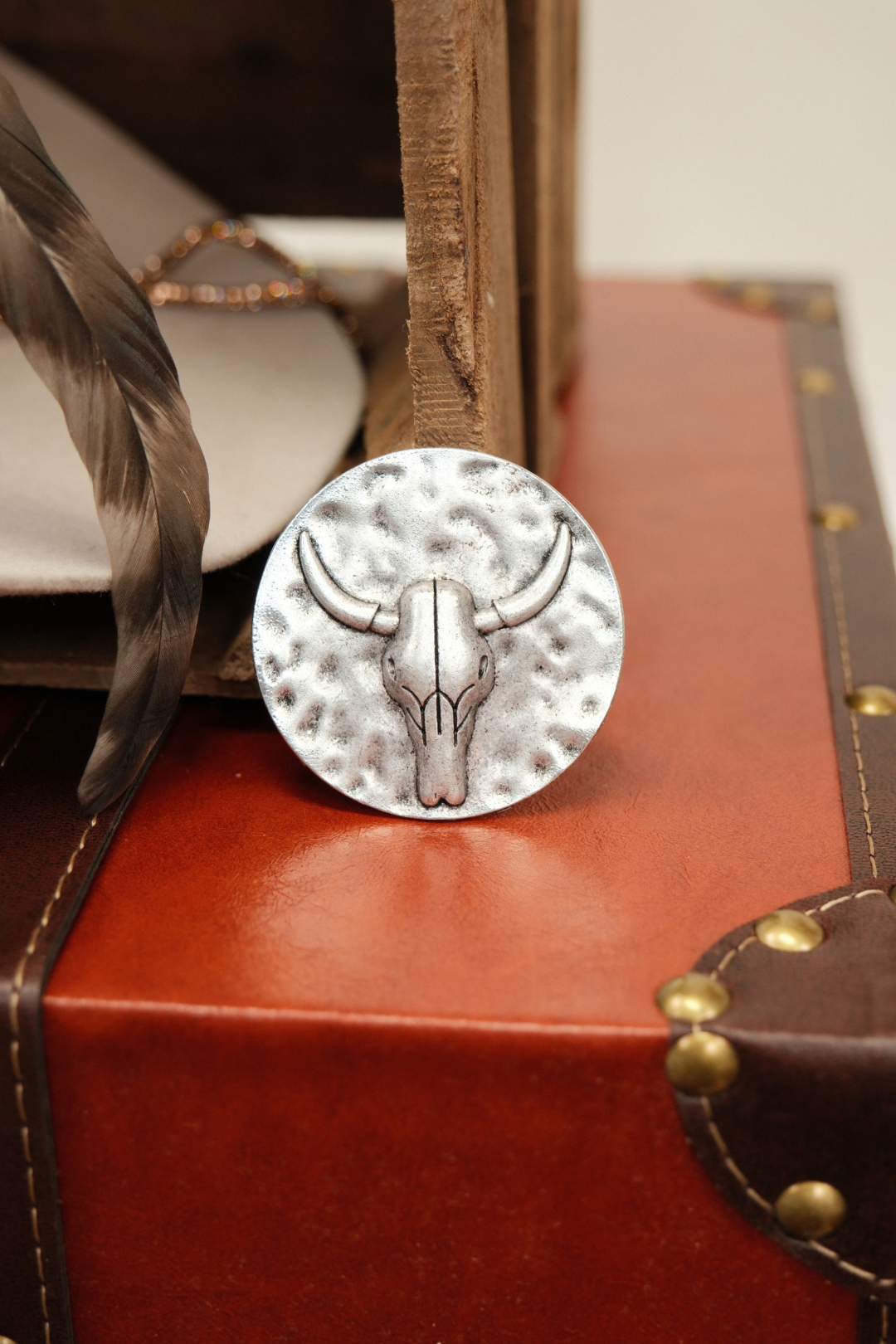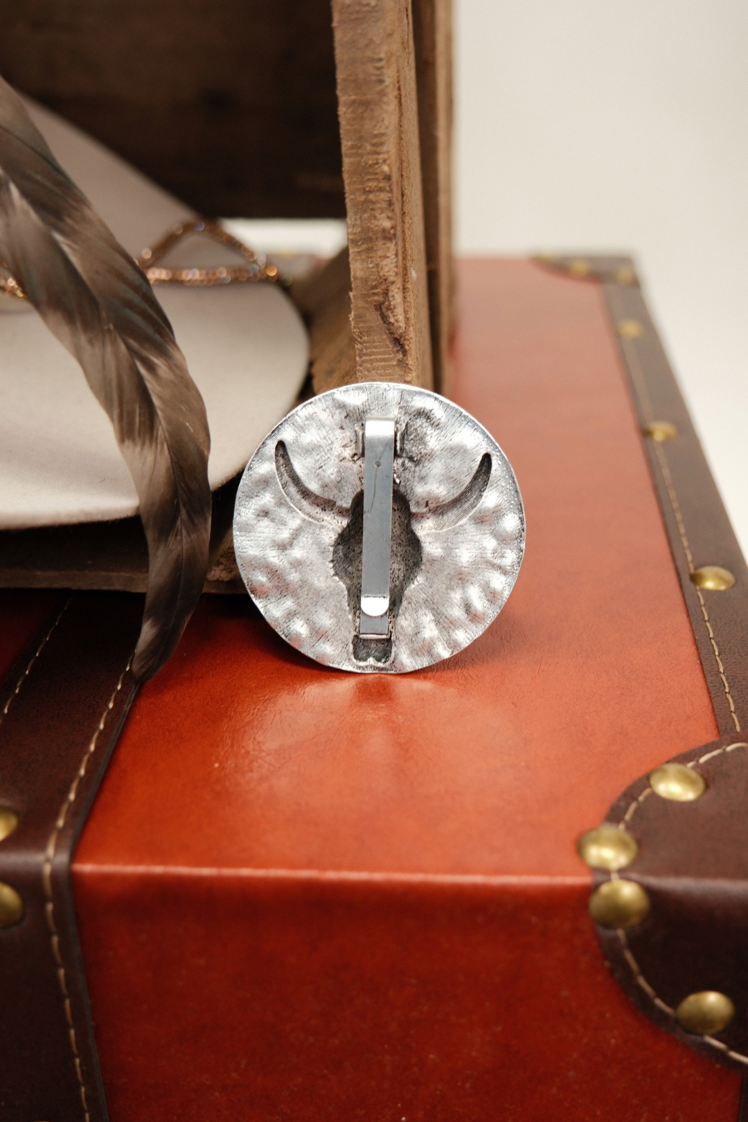 Channel your inner outlaw with the Hammered Horns Brooch—a bold bull skull design crafted in hammered metal for that worn-in, vintage look. Made to clip onto our leather scarf slides, this brooch is the perfect finishing touch for wild rags, bandanas, or denim lapels. Whether you're styling for the rodeo or adding edge to your everyday outfit, this piece brings raw western energy in a compact statement.
