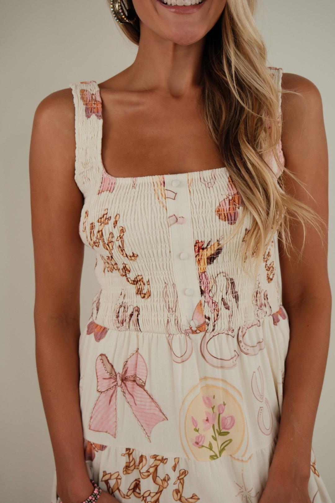 Saddle up in style with the High Desert Rodeo Maxi — a free-spirited western dress with a whimsical twist. This full-length beauty features a stretchy smocked bodice for the perfect fit and a breezy tiered skirt that moves with you from sunup to sundown.