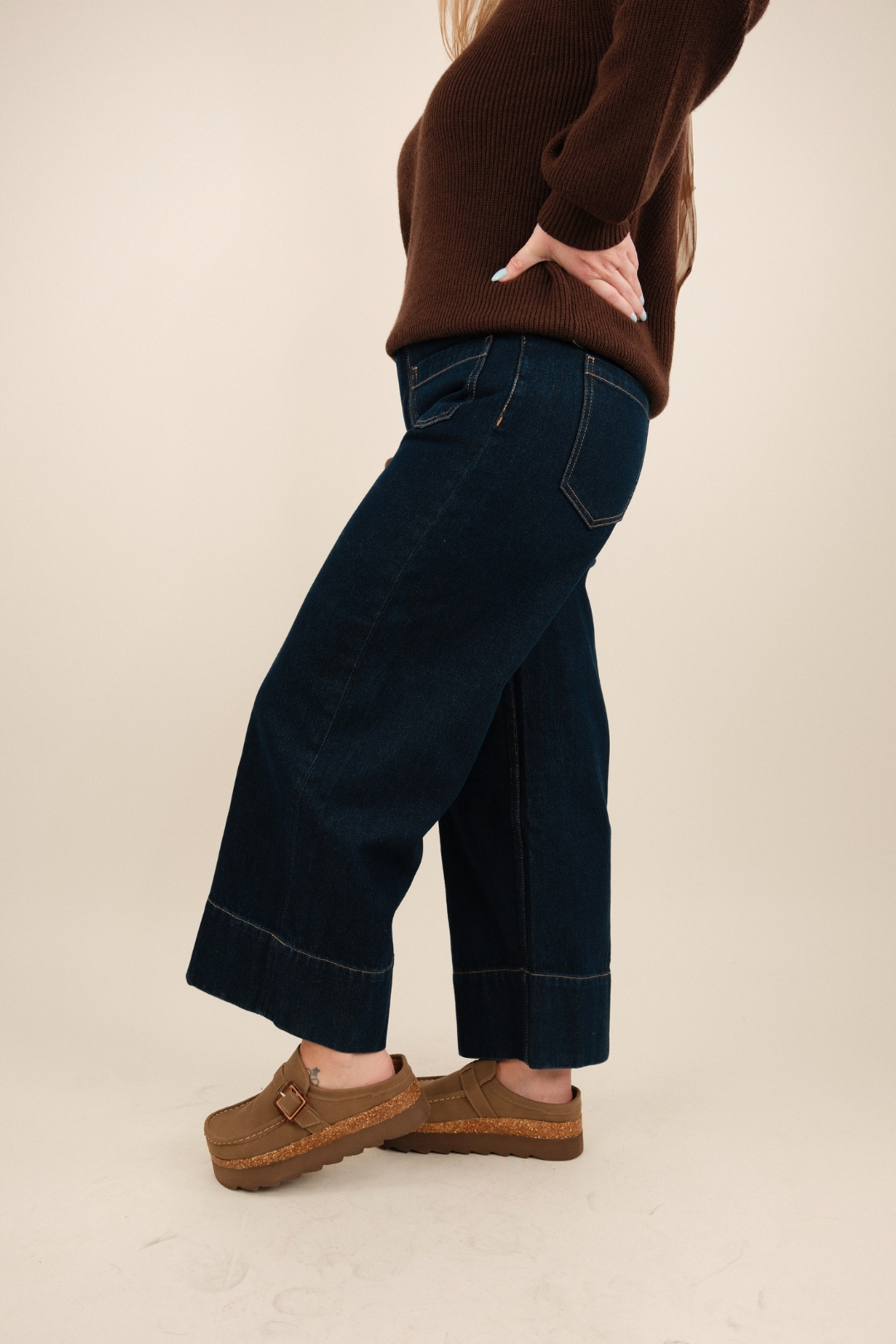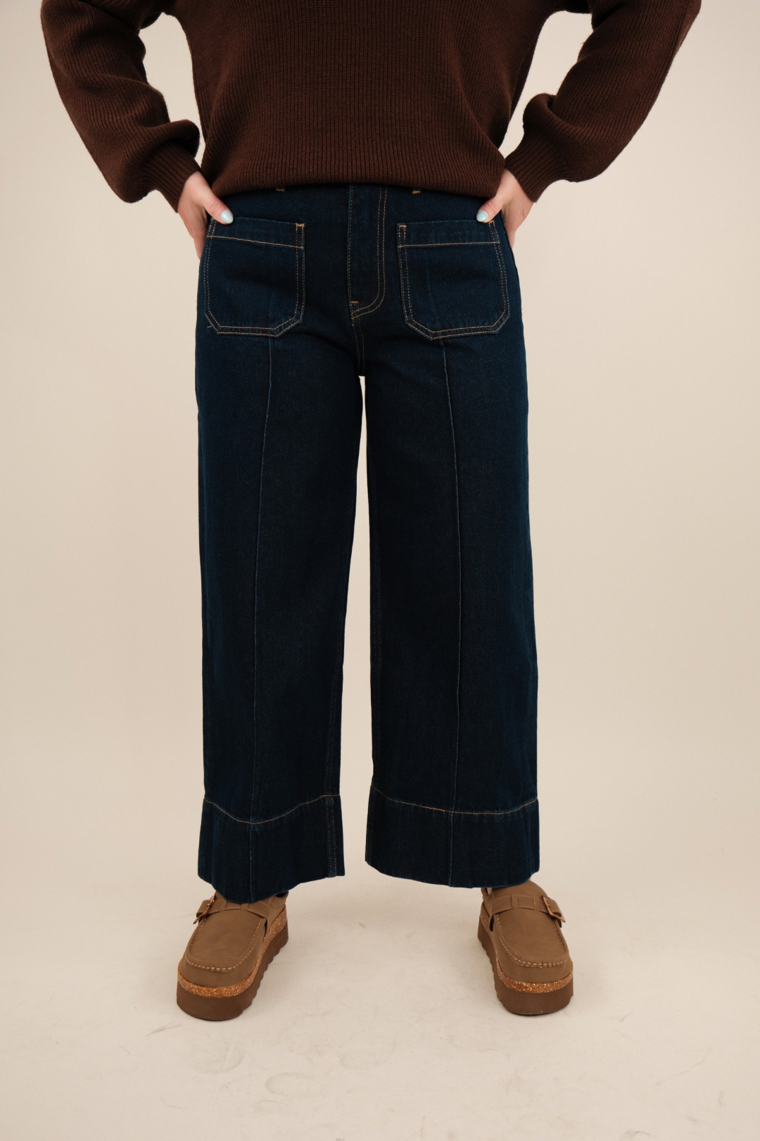 Bring modern edge to classic cowgirl style with the High Desert Wide Leg Cropped Jeans. Designed in a dark wash denim, these jeans feature a cropped wide-leg silhouette that’s as flattering as it is versatile. Functional front patch pockets on the legs add a touch of utility, while vertical seams down the front elongate the leg for a sleek, tailored look.