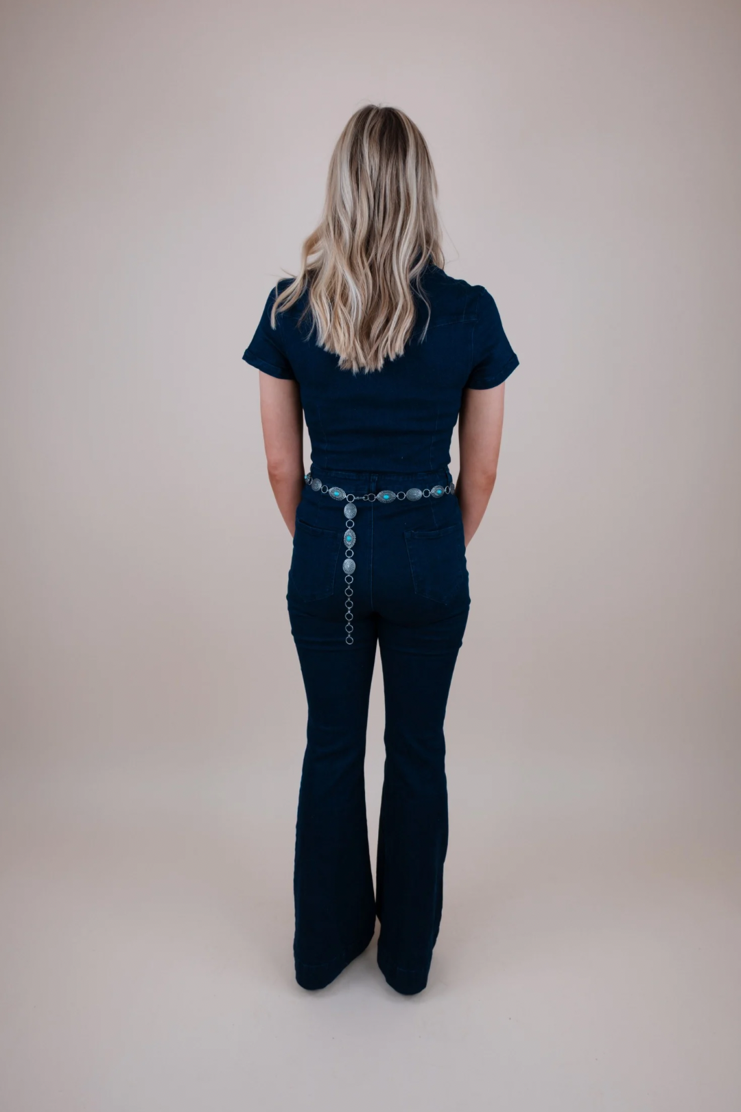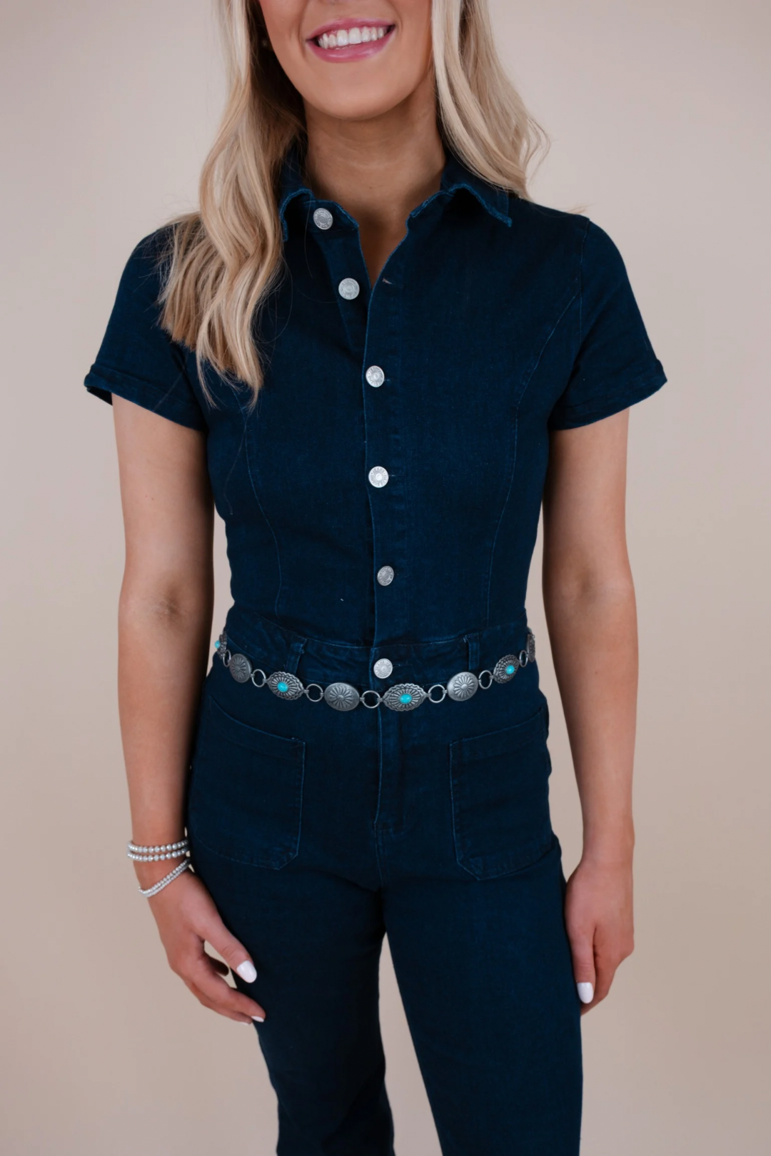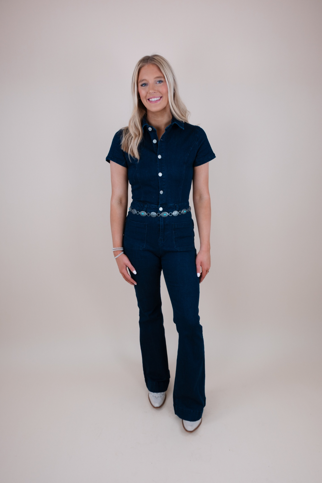 The Ironwood Utility Jumpsuit blends form, function, and fierce cowgirl confidence. Crafted from high-stretch dark wash denim, this full-length jumpsuit hugs in all the right places while holding its shape wear after wear. With short sleeves, functional buttons, and utility-style pockets, it’s as practical as it is flattering.